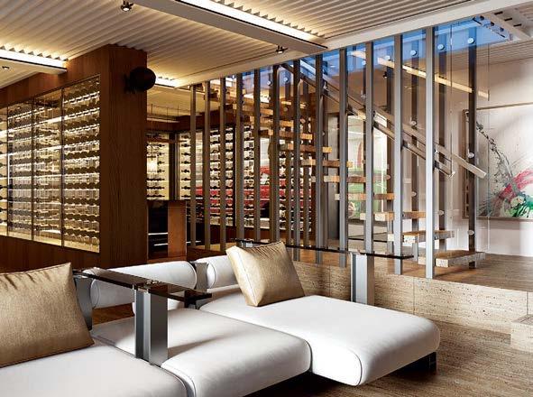 Comfort, provided by ample inviting seating, ranked high on Dre’s list of priorities—“Comfort is number one for me; this is my sanctuary,” he says—as was striking a balance between classic and contemporary elements within the artfully layered spaces. “Our attempt was to create a form of visual symphony here, at a level that, like a Beethoven composition or a song by Dr. Dre, you can’t absorb it all at once,” Behnke muses. Unexpected moments such as origamilike pendants in a hallway or the entry stairwell’s curved-glass panels all achieve this effect. The overall attention to detail and artistry speaks to a perfectionism long associated with the exacting homeowner. “Imagine having a house you never want to leave,” Dre concludes. “That’s what’s been created here. I have my own world in my home with everything I’ve always wanted.”