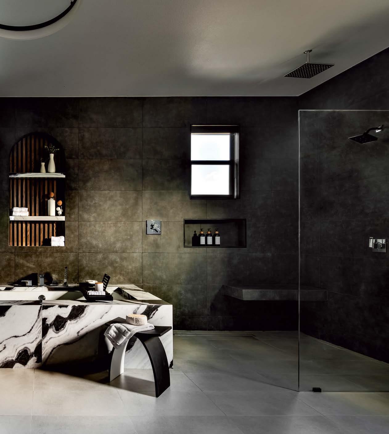 A Duravit bathtub framed in dramatic black-and-white porcelain and set against dark wall tile, both from Surface Concepts & Slabs, is the star of the primary bathroom. The flooring is from Roca Tile USA; dual walk-in glass showers flank the tub.