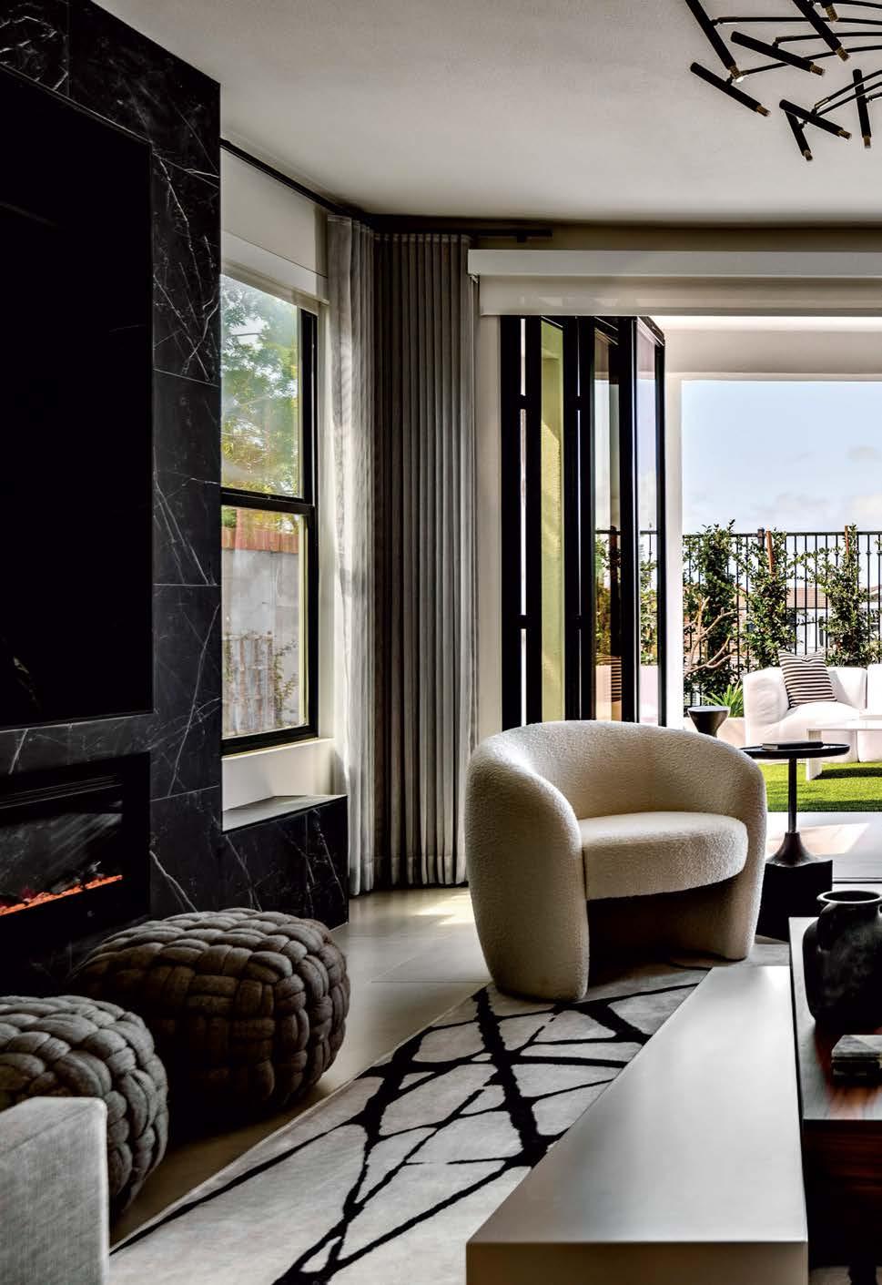 Above: In a corner of the living area, a bouclé-upholstered Urbia Imports chair and Four Hands side table rest beside a linear fireplace. The extended surround of charcoal-hued porcelain tile, framing a flat screen, is from Surface Concepts & Slabs.