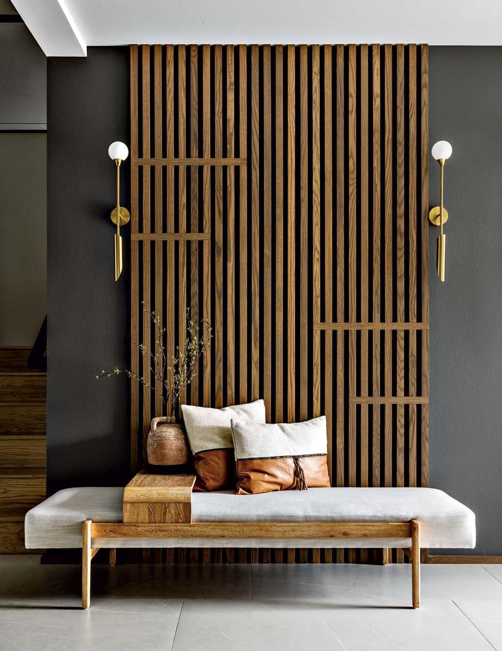Stained white oak vertical slats accent the entryway, set off by walls of Dunn-Edwards’ Boat Anchor. Vintage-style sconces and Four Hands’ Fawkes bench—inspired by classic telephone benches— nod to the design scheme’s midcentury modern influences.