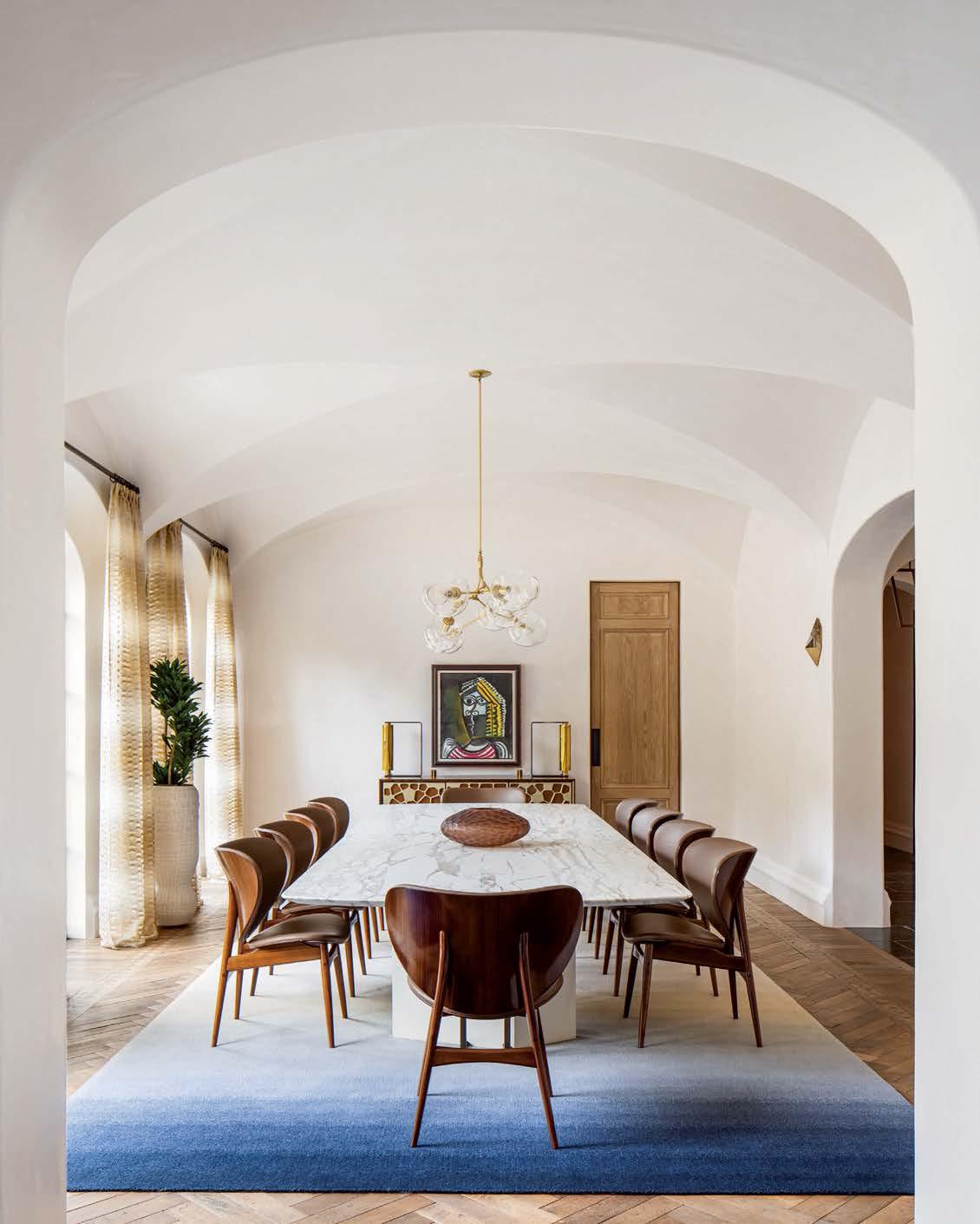 Above: The formal dining room is anchored by a table of Calacatta marble and brass flanked by Berenice Vien dal Mare chairs. A Lindsey Adelman Studio chandelier hangs above. Draperies feature Weitzner’s Isis fabric and the rug is Scott Group Studio.