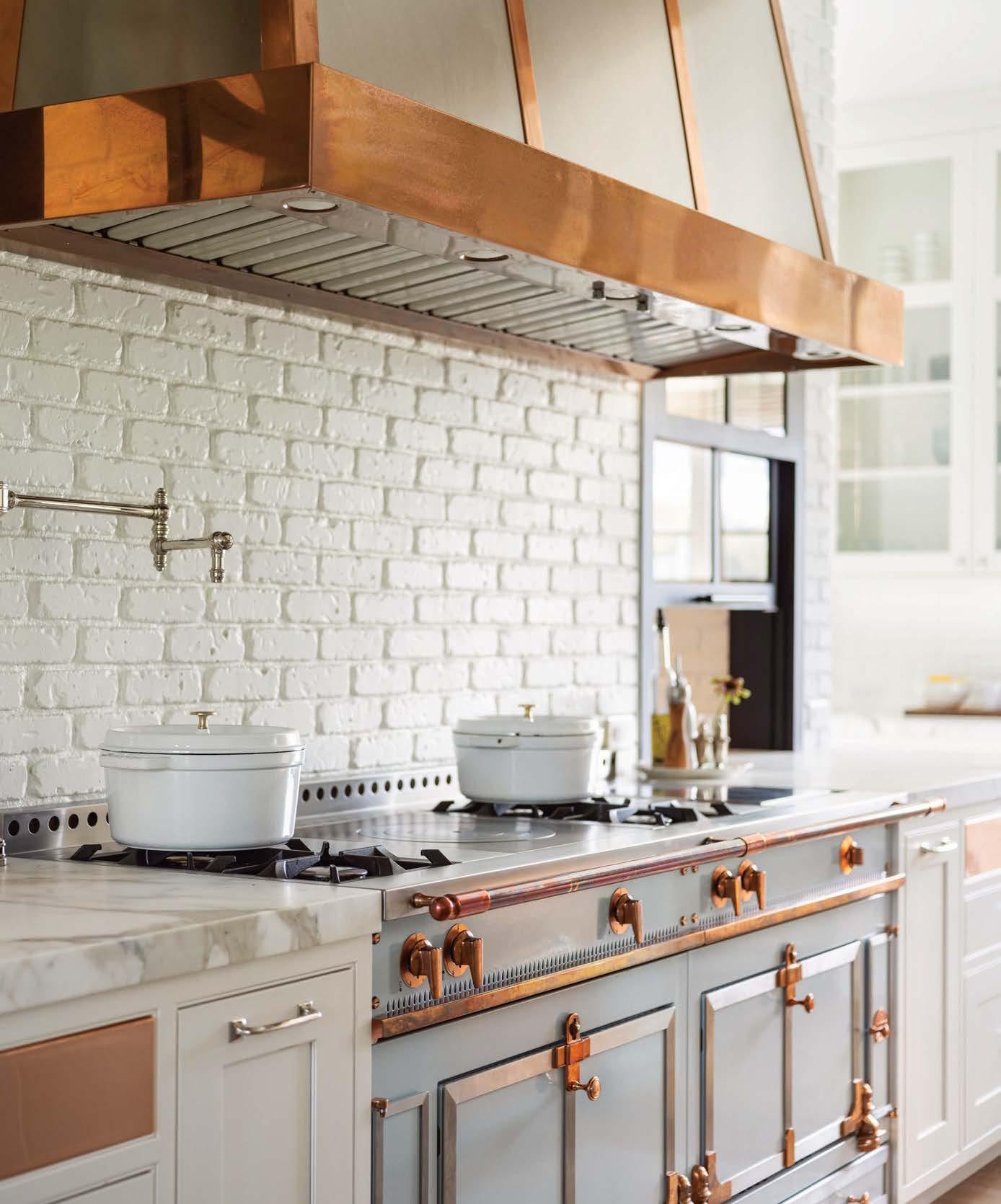 Farrow & Ball’s Skimming Stone refreshed the cabinetry, setting off Calacatta marble countertops, while matte porcelain tile from Stone Source backdrops a Wolf range. Alison Berger Glassworks pendants punctuate the barrelvaulted ceiling of reclaimed brick.