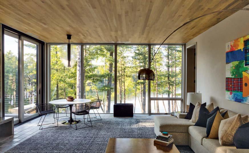 lines, they are softened by traditional materials such as cedar shingle siding and patinated zinc. “The water and the woodland nature of the region influenced us to design something that looks like a modern house on the East Coast but translated for the lake,” Bednyak says. Although it’s brand new, the efforts of landscape architect Simon Prunty and his team to preserve large trees and strategically place new plantings allow the residence to nestle into the site, giving it the feeling of long being there. Altogether, this creates a timeless structure whose proportions are grand but also warm and approachable.