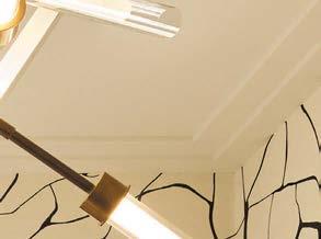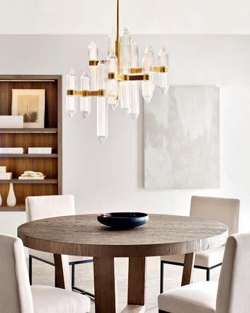 the views. Inspired by photographer Lincoln Schatz, who captures nuanced landscape shots of the Midwest and Lake Michigan, Soucie’s team pulled up photos of the lake in every season. “We laid those on a table, and they inspired our color palettes,” the interior designer recalls. “Nothing was supposed to stop the eye; the focus is kept on the outside.” As such, most of the lighting is recessed and unobtrusive, with one major exception: an orbital chandelier in the living room that serves as an artful focal point upon entry.