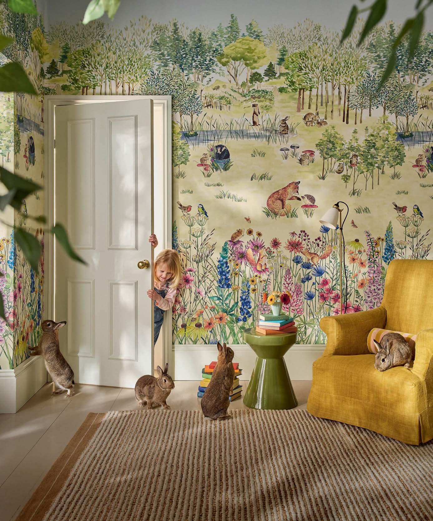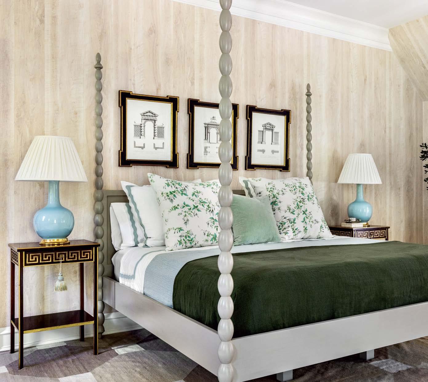 Still, certain areas were designed to be squarely for the adults and are accordingly elegant. Inspired by Tory Burch’s iconic, Daniel Romualdez-designed Southampton boudoir, the primary bedroom offers a restful retreat from the hubbub with its faux-bois wallpaper, vintage architectural prints and delicate floral fabrics awash in creams and greens.