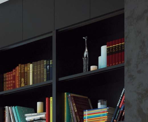 the two seating groups below. “Lining the room with low horizontal bookshelves made it look cool instead of ordinary,” Mitchell says. “It’s a great way for the owner to put art on display without overcommitting to it.”
