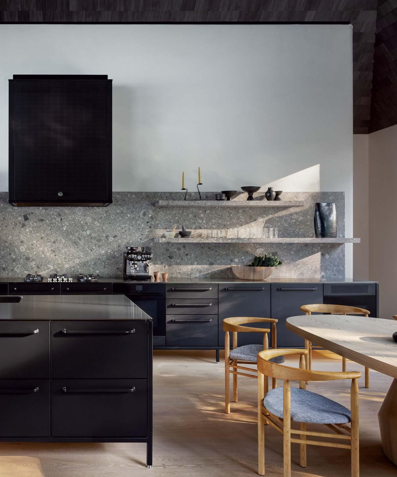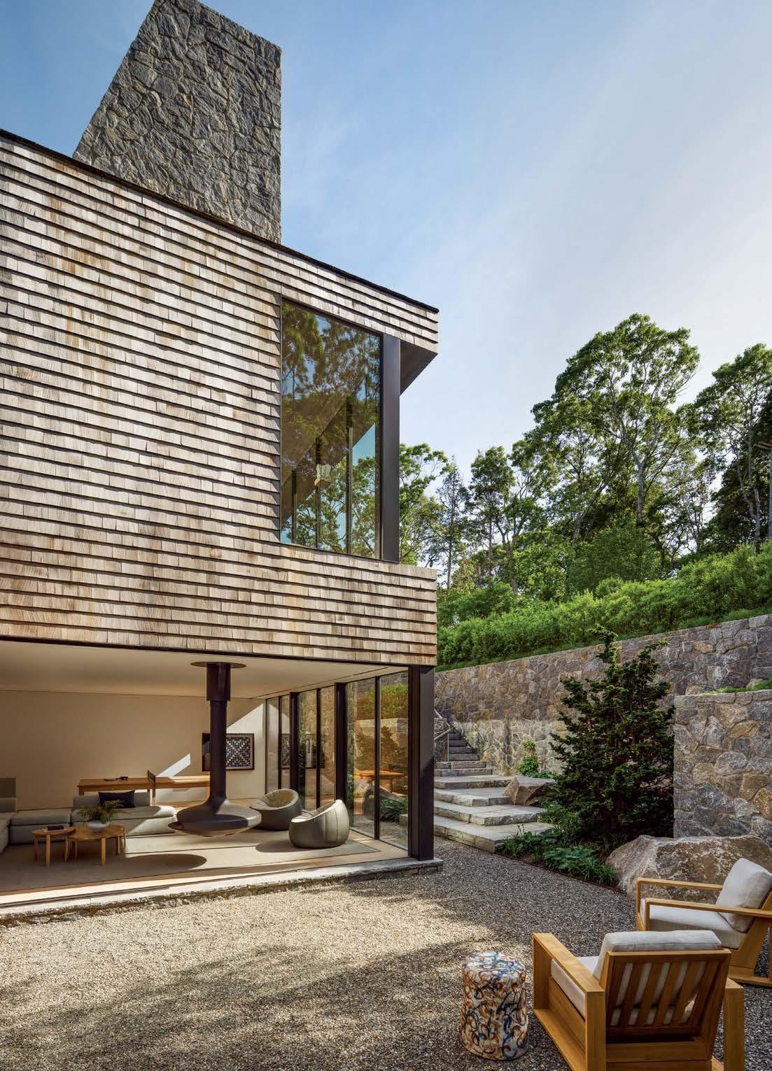 design that “quietly settles into the rhythm of the landscape,” Rosensweig says. “The natural materials are woven together in a restrained palette, allowing simplicity and texture to speak with quiet confidence.”