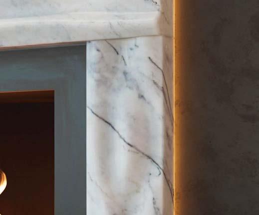 Once the dated millwork and walls of bookcases were cleared away, the focus was on making several judicious tweaks to the layout, borrowing space from the dark and awkwardly proportioned dining area to create a pantry and laundry room. Working with project manager Kevin Enright and general contractor Brendan Brew, Mitchell redefined the space with a curved wall that conceals the utility areas while echoing the building’s muscular exterior architecture. Since there was no way to obscure the living area’s massive columns, Mitchell and Isbell played them up with overscale fluted cladding. With Enright and Brew, Mitchell also drew up a plan to raise the dropped ceilings and add graceful plaster moldings to delineate