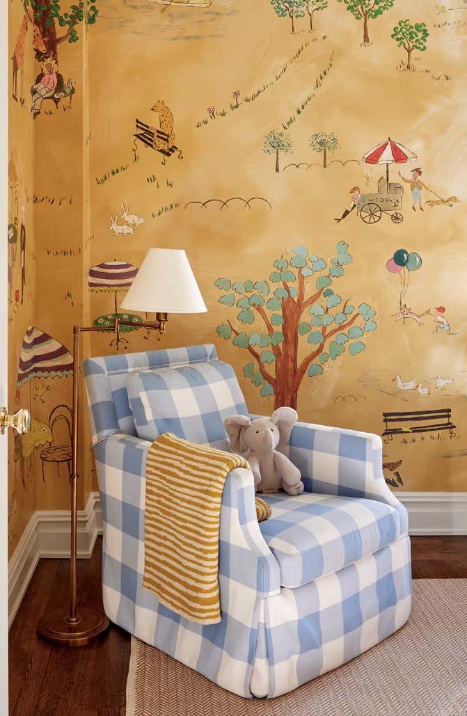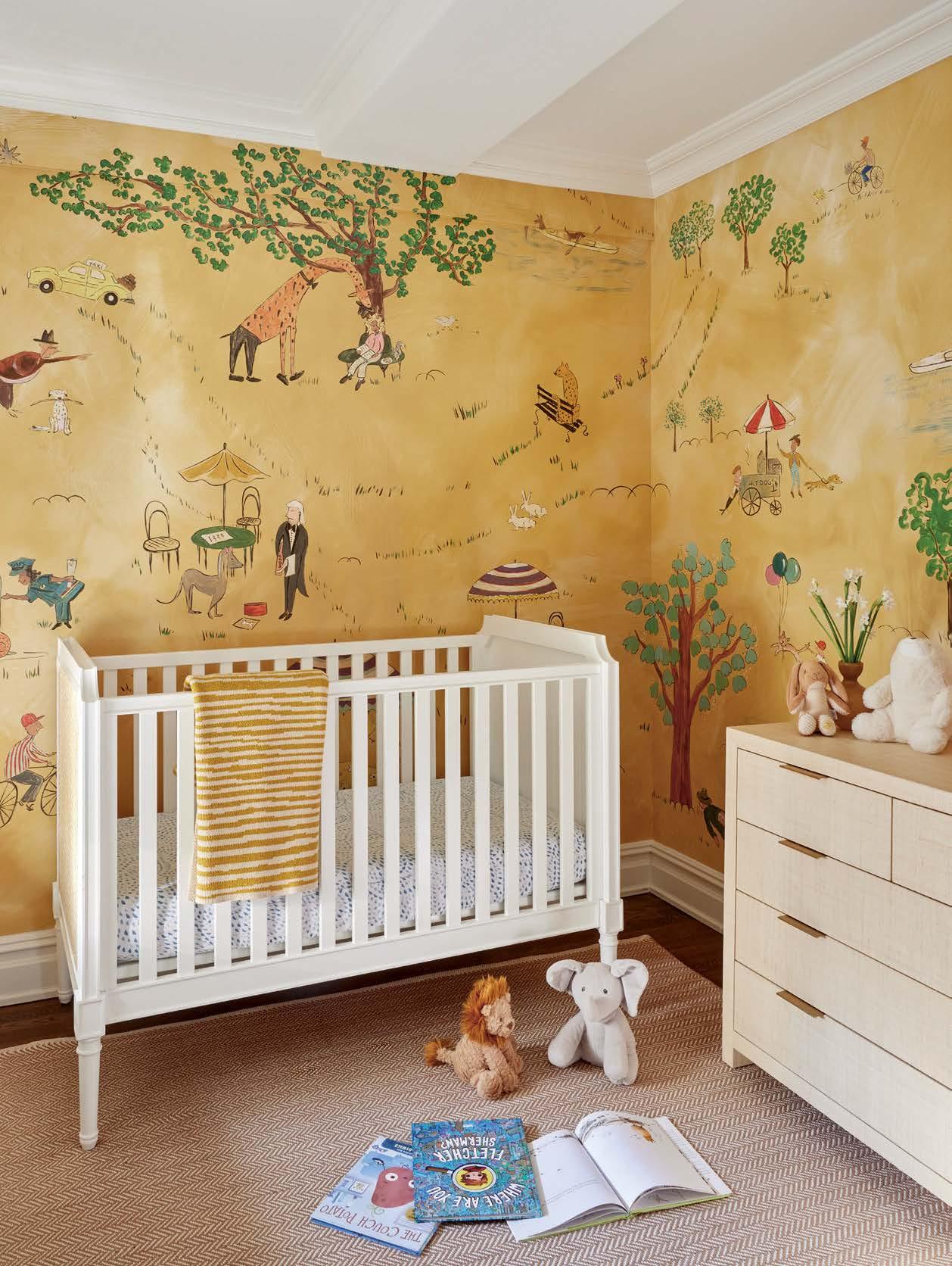 Opposite: The nursery delights with a Prospect Park Mural wallcovering by The Lawns. An Annie Selke herringbone linen rug is a comfy place for floor play and book reading. The crib is Serena & Lily.