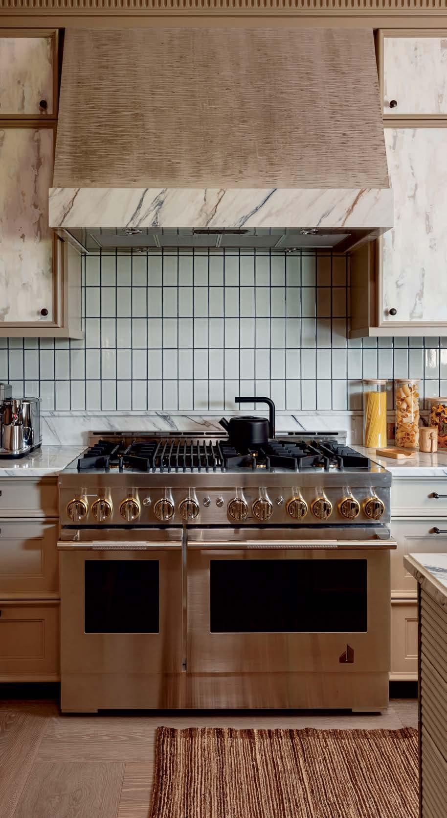 Above: Tiles from Ceramica Francesco De Maio line the ceiling and backsplash of the kitchen, where glossy cabinets mimic the La Cornue range. The breakfast nook features a diner-inspired banquette, a Mecox table base with a custom top and an antique Venetian-glass chandelier.