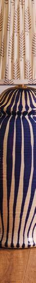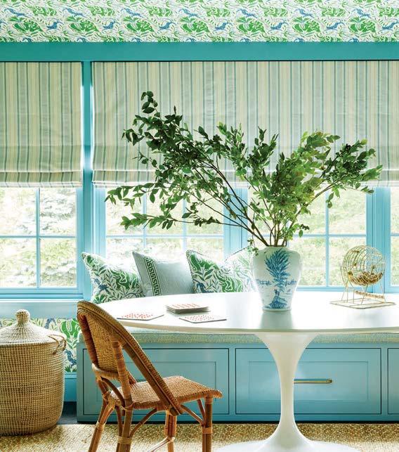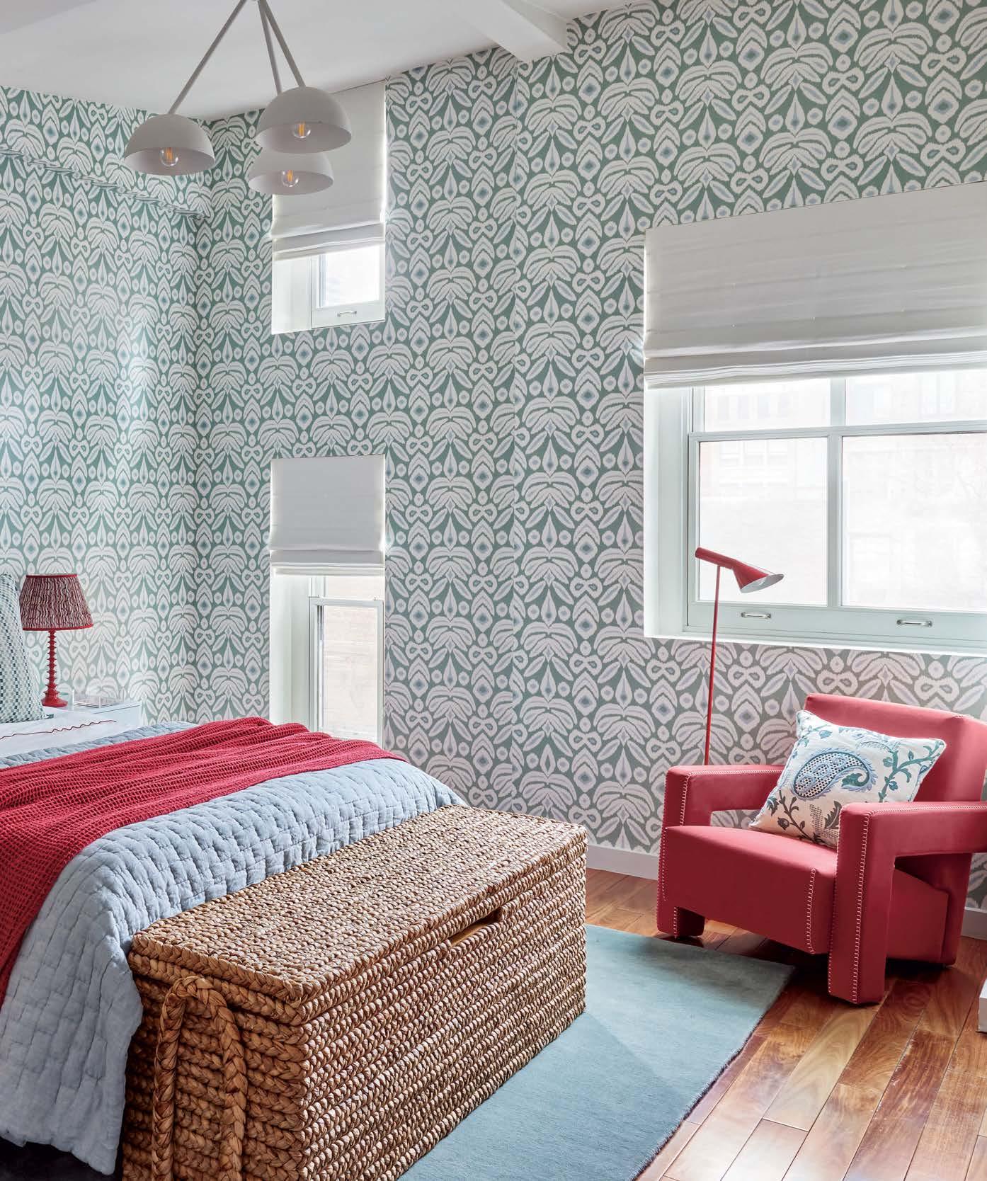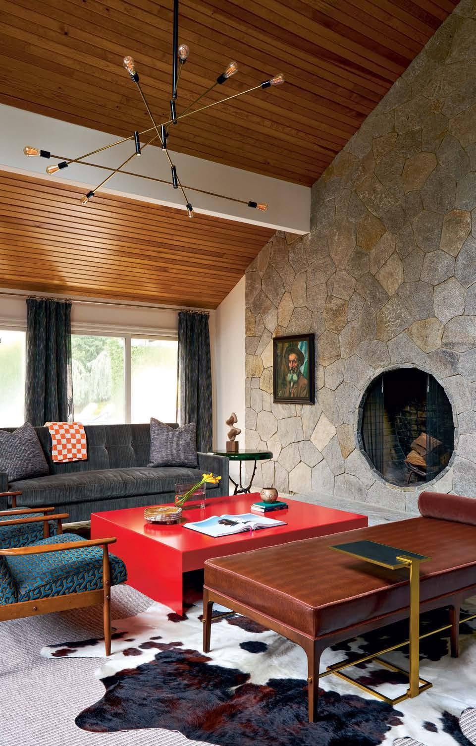 patterning. “With those wood walls, it was never going to be anything but dark,” Bromley says. “We leaned into that idea. It’s a moody space in the midst of all this light.” The room, however, doesn’t completely stray from the rest of home’s eclectic style thanks to a mix of geometric and floral patterns, along with pops of red, orange and blue. It’s the perfect setting, the designer says, for these consummate entertainers to retire with guests after a leisurely dinner.