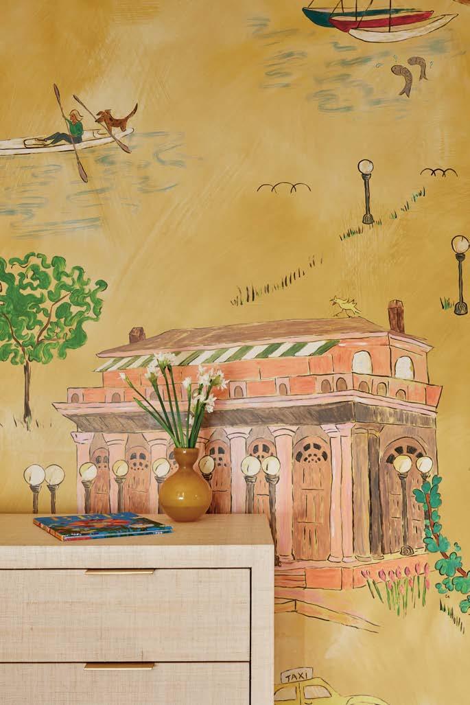 But, in the nursery, Lederman happily committed, “right off the bat,” to a bold, playful wallcovering that need not do double duty; it simply singularly delights. “It’s my favorite moment in the apartment,” she says. Inspired by the nearby iconic Bemelmans bar at the Carlyle Hotel and created by an artist friend of the clients’, the wallpaper is “a fun, kooky nod to the neighborhood,” she adds. “When the sun hits that yellow, the room comes alive with dimension. You go in there and it’s cozy and feels happy. Who doesn’t want that for their kid?”