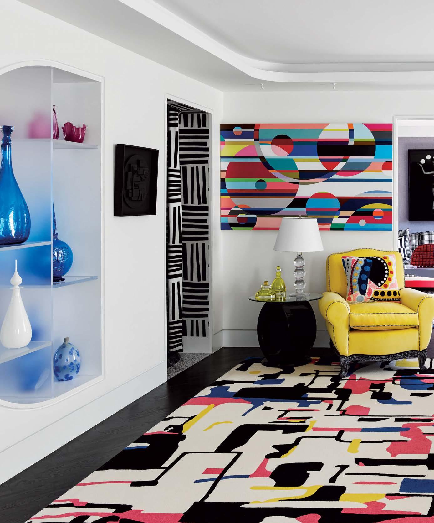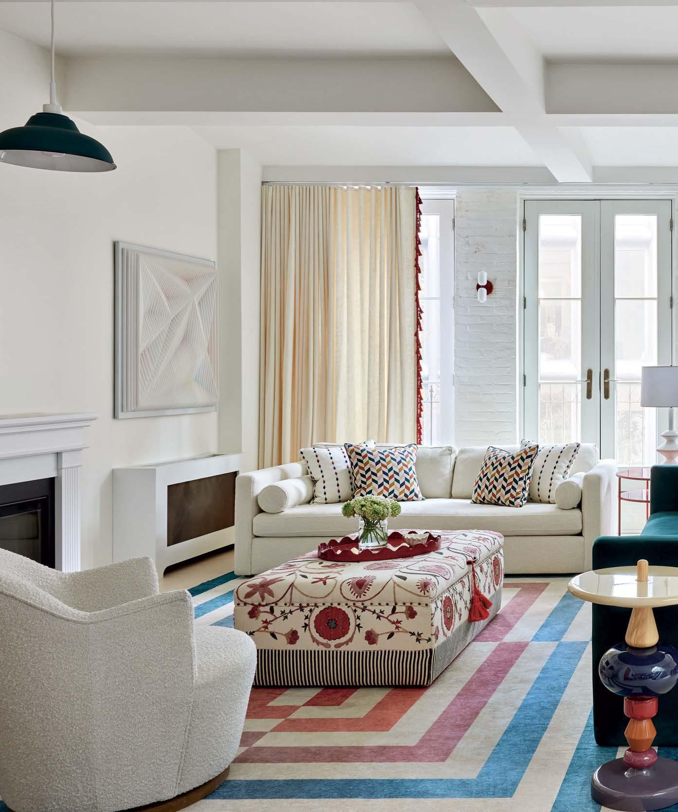 Previous page: A graphic Jonathan Adler rug anchors the same space, where an Oka ottoman links multicolored sofas. The sculptural side table is from the MoMa Design Store and the 3D artwork is by J. Margulis.