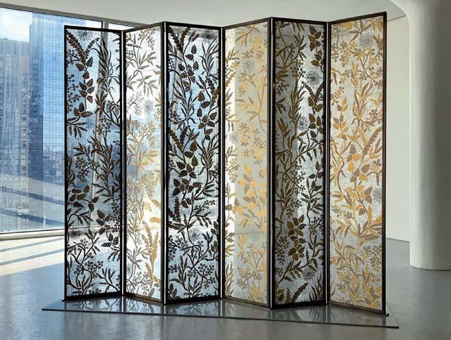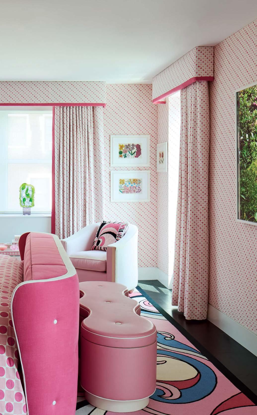 Previous page: Art by Sebastiaan Bremer hangs over a bespoke sofa, with a set of eight works by Spencer Finch above the banquette. A Schumachercovered ottoman sits between vintage chairs and a settee clad in a painterly Pierre Frey fabric.