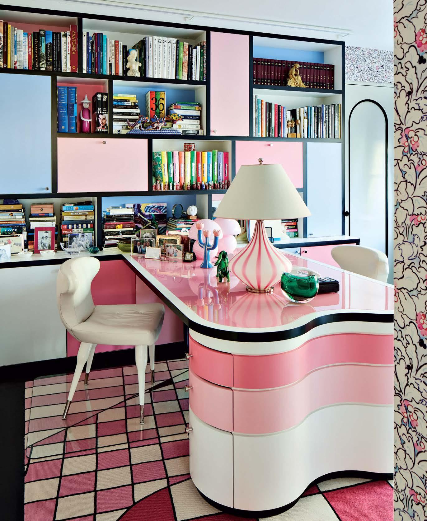 Opposite: The office is a study in geometry with its desk and shelving unit fabricated by general contractor Tony Wala and Stark Carpet rug based off a Pucci scarf. A bespoke armchair sits at the desk lit by a Murano-glass lamp.