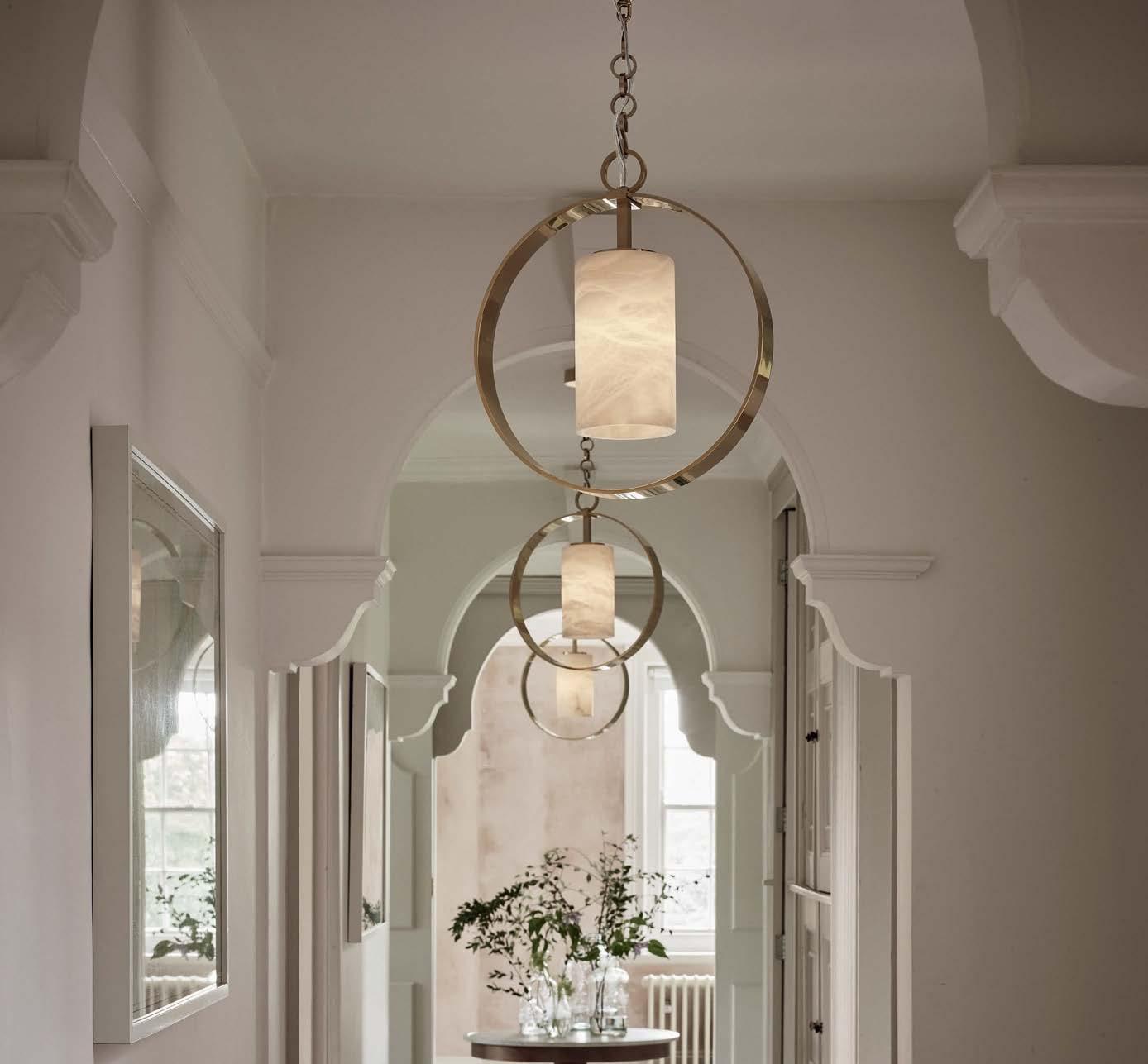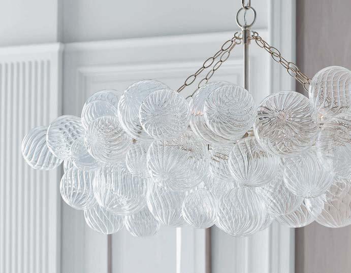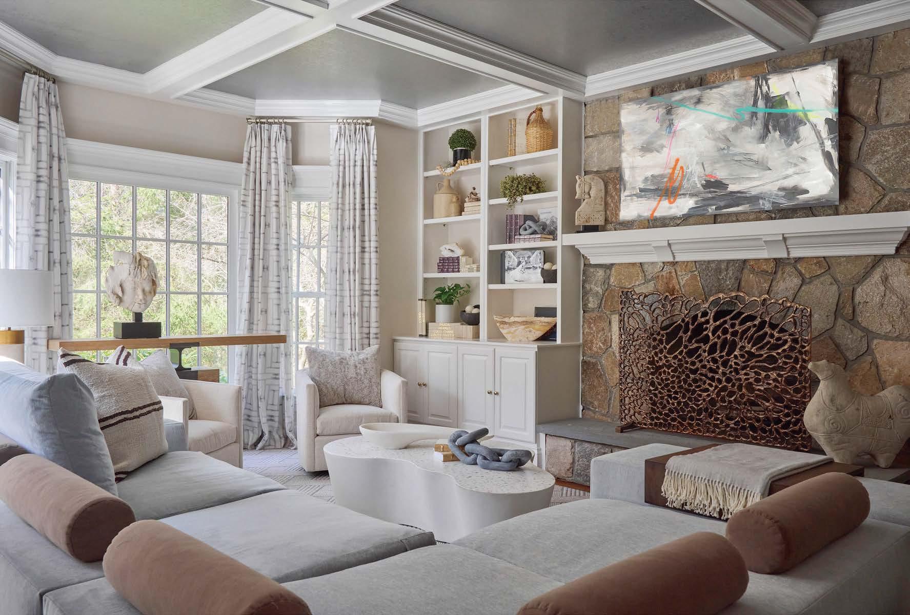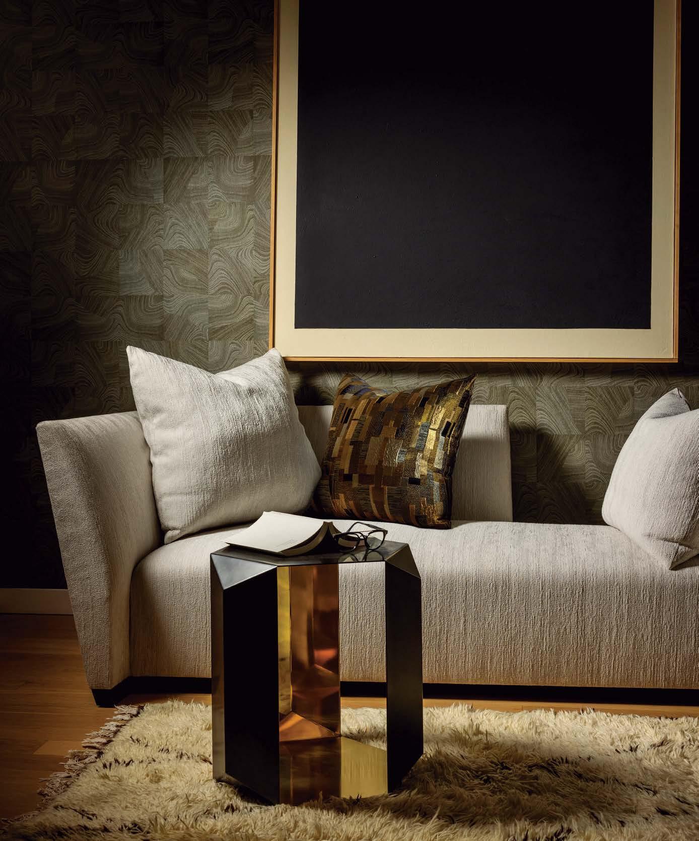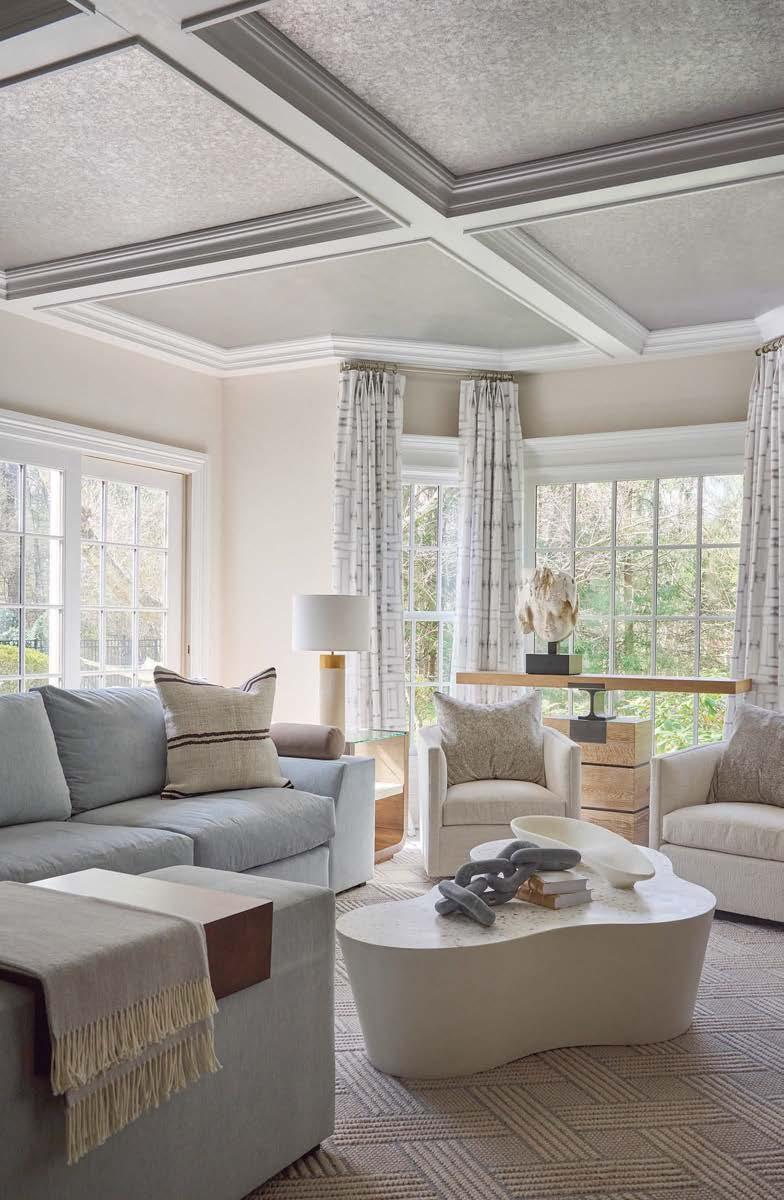 kinetic mobile and Rebel Walls’ Waves wallpaper as an accent. The curves of the Athena Calderone for Crate & Barrel coffee tables mimic those of the bouclé-covered Castlery sectional.