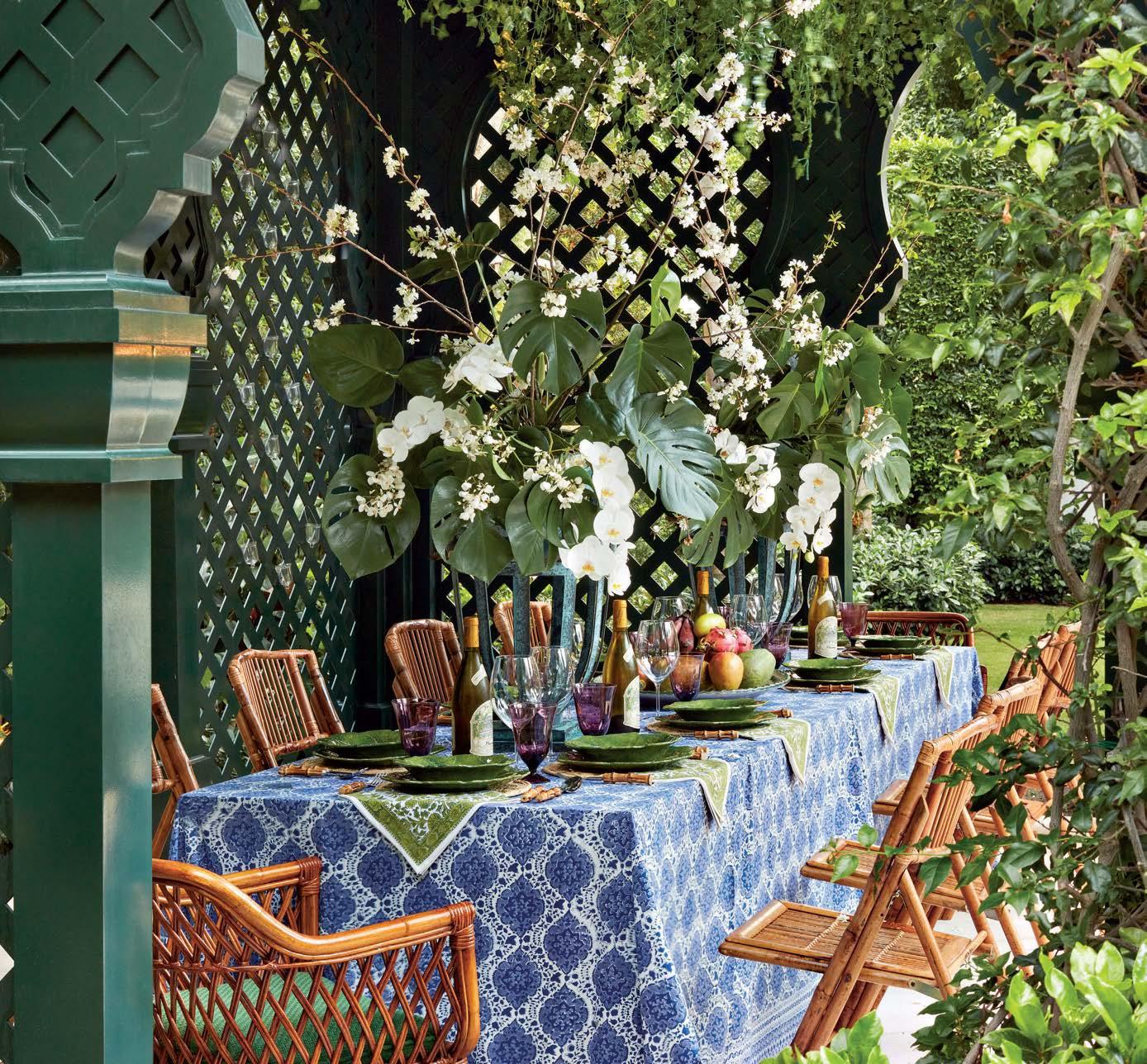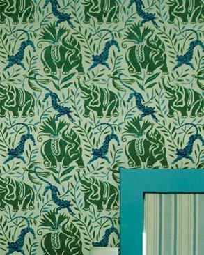 Right: Painted Benjamin Moore’s Oak Grove, a hidden bar is a chic surprise. Neisha Crosland for Schumacher’s Caterpillar Leaf wallpaper drives home the garden theme. The tableware is from SL & Co.