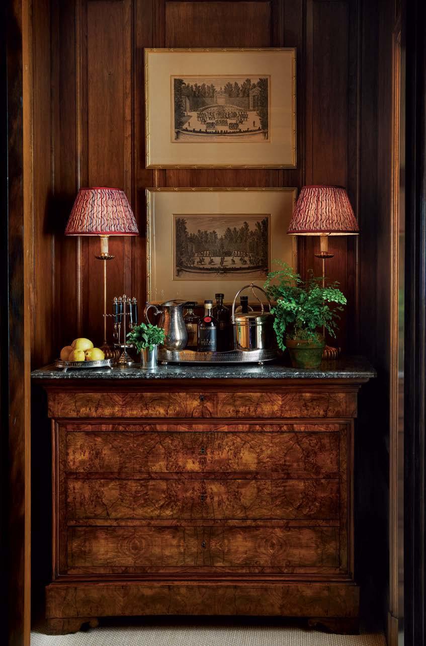 Above: Vintage pieces define a nook in the library. Antique prints stack above the Chairish-sourced, marble-topped walnut chest and gilt buffet lamps with Penny Morrison shades.