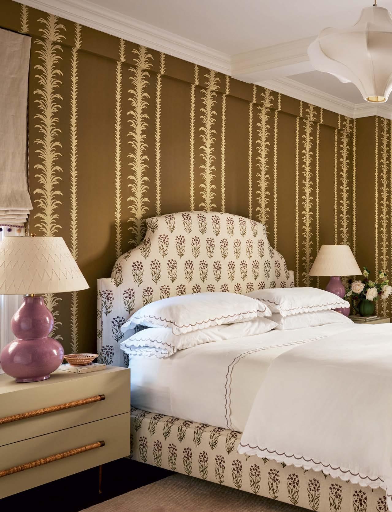 Palm Stripe wallpaper by George Spencer Designs swathes the primary bedroom, joined by an Oomph Home bed upholstered in a Penny Morrison textile. The lantern is by Shades from the Midnight Sun. Vaughan lamps top the Chelsea Editions nightstands.