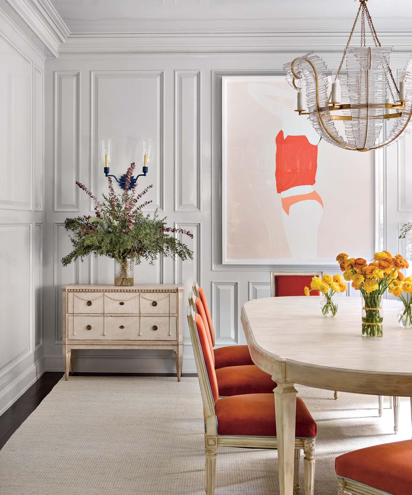 This lighthearted vibe can be seen immediately as one glances down the entry gallery into the punched-up dining room. “It was a very formal, heavy space,” Bromley says, pointing to the builtin display cases the former owners had used to showcase their collection of objets d’art. For a fresh perspective, she coated the walls and ceiling in a pale blue-gray lacquer, creating colorful contrast with a Natasha Law painting in shades of peach, pink and orange, as well as dining chairs upholstered in a paprika fabric with a flame chevron pattern on the backs. “I knew I really wanted those chairs to be as interesting from the front as they were from the back,” muses Bromley, “as that’s the view from the gallery.”