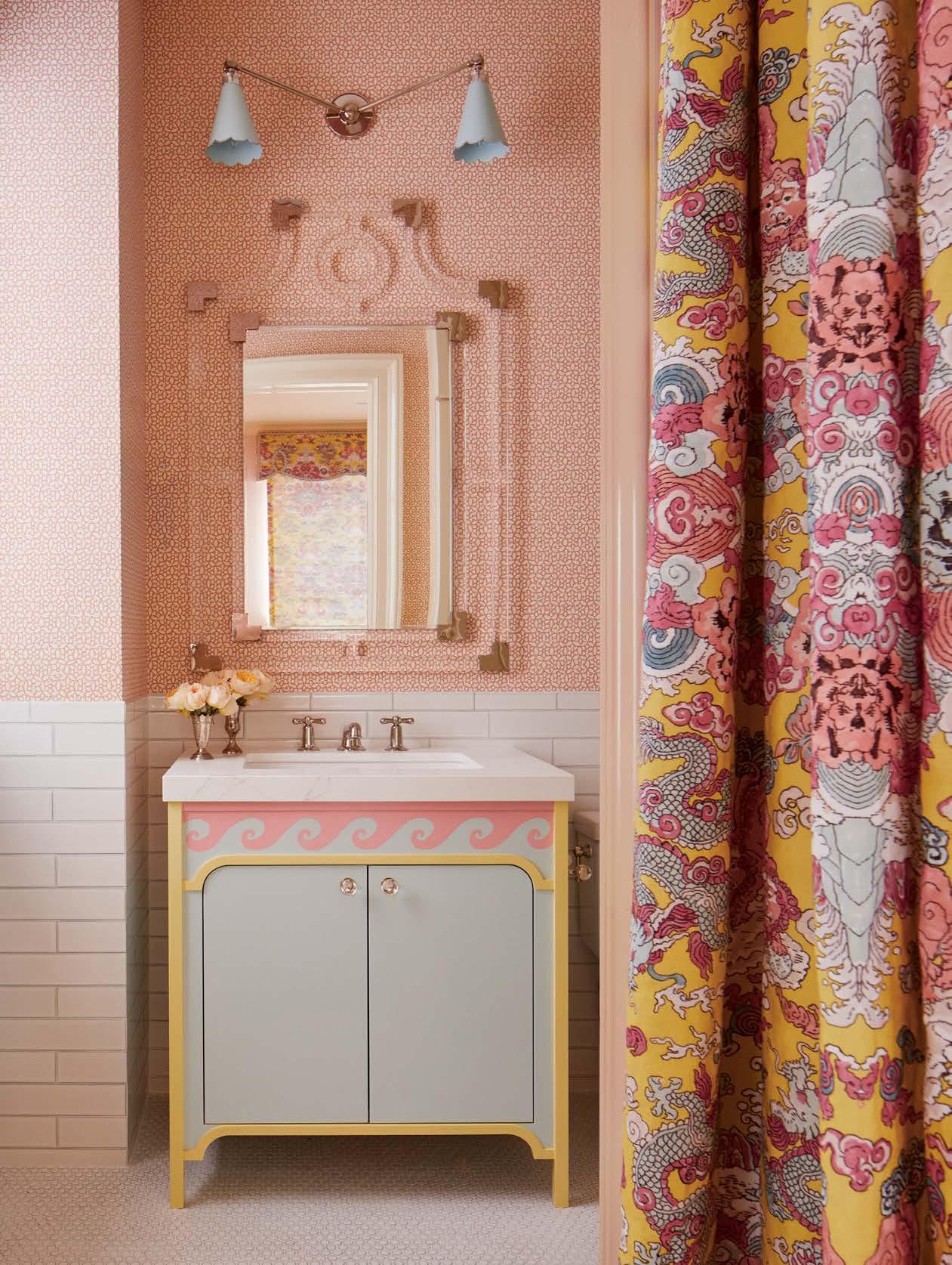 Opposite: The girls’ bedroom palette carries into their bathroom, with Jim Thompson wallpaper, a custom vanity painted by Theresa Nardone of Bella Terra Design and Ann Sacks subway tile. A Coleen & Company sconce crowns the Mirror Home acrylic mirror.