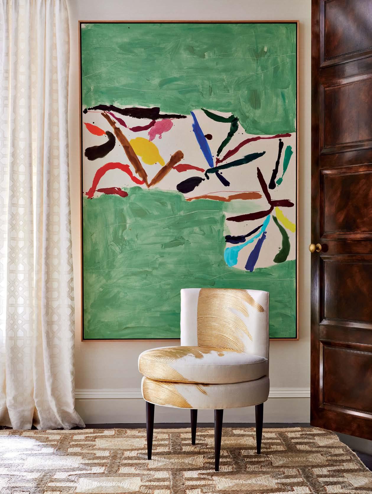 A piece by Kikuo Saito above a custom chair in a hand-painted textile makes for a bold moment in a living room corner. Designer Brittany Bromley layered the look with a Patterson Flynn rug and drapes of Cowtan & Tout fabric.