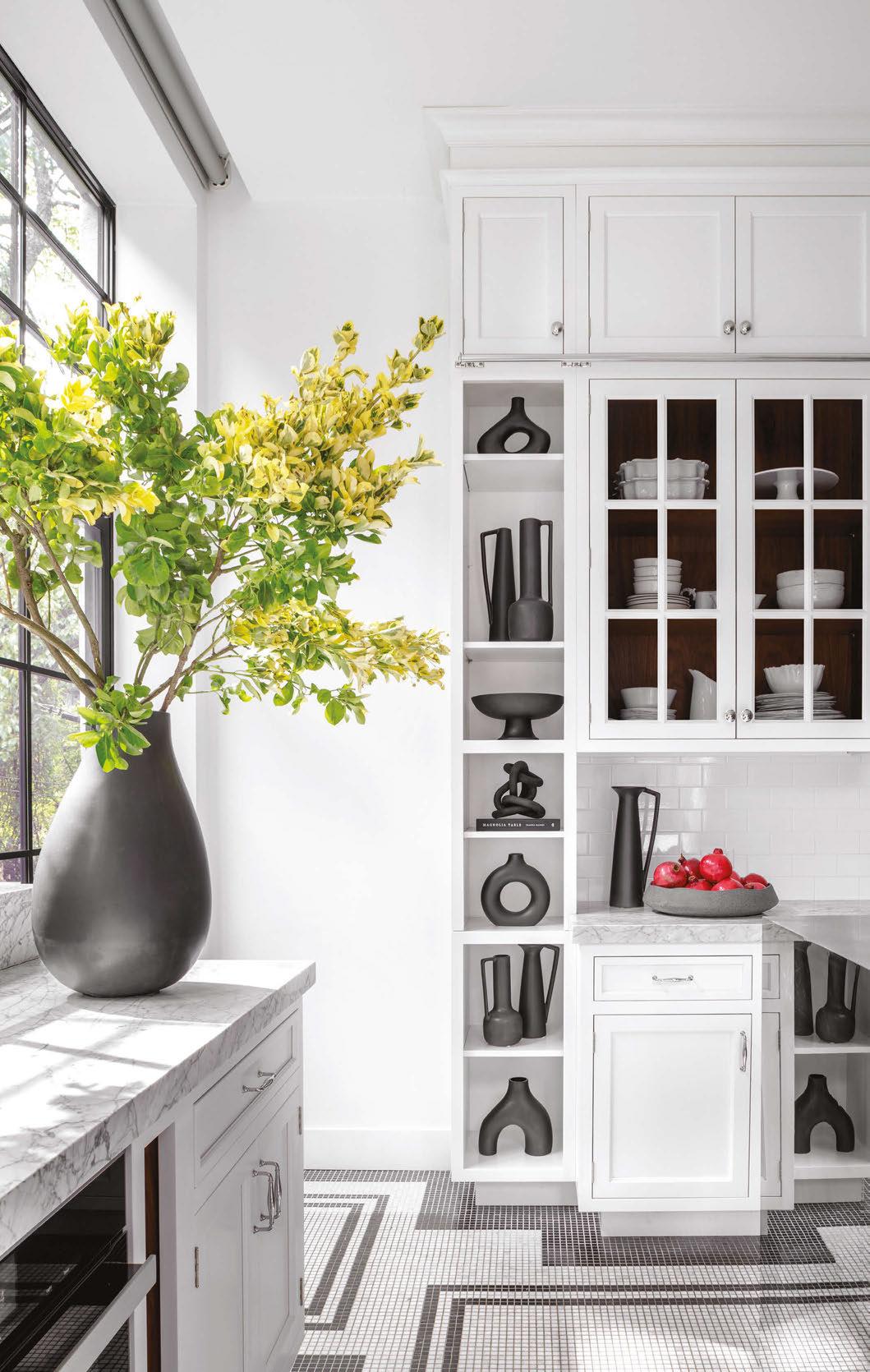 In the dining room, green pops up on mosshued linen upholstered chairs and, in a delightful surprise, swathes a glossy wet bar hidden behind a wallpaper-wrapped door. Said wallpaper—an airy graphic of abstract botanical shapes outlined in black—works almost as an oversize stripe, echoing the box-pleats on the custom pendant shade. The same green that peeps out from the bar is repeated on living room book casings that Lederman designed in the spirit of Josef Frank. The cases, finished with cabinet knobs that are “like jewelry for the room,” are freestanding, so if the clients ever move, they can travel with them.