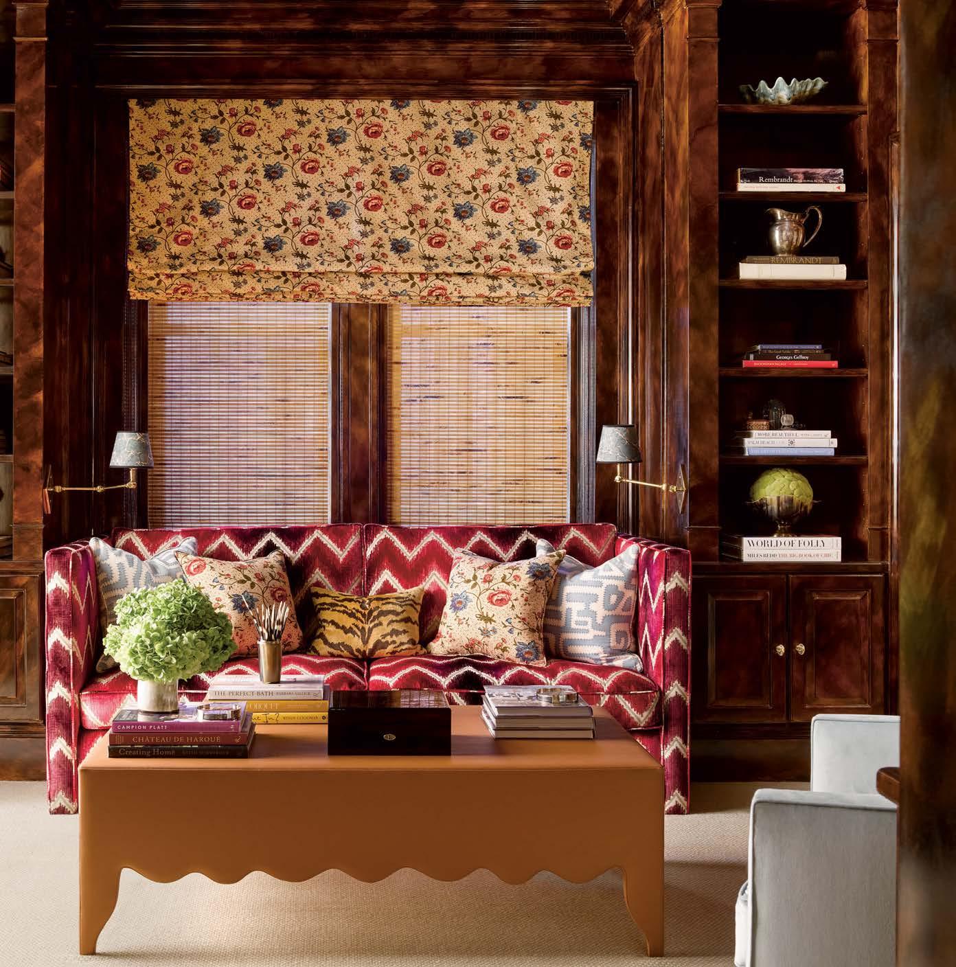 Right: Between the tortoise-shell-patterned cabinetry painted by artist Shelly Denning, a sofa in a Schumacher chevron packs a punch. Bromley turned to a Pierre Frey floral for the Roman shade and accent pillows, while a Designers Guild faux leather covers the coffee table.