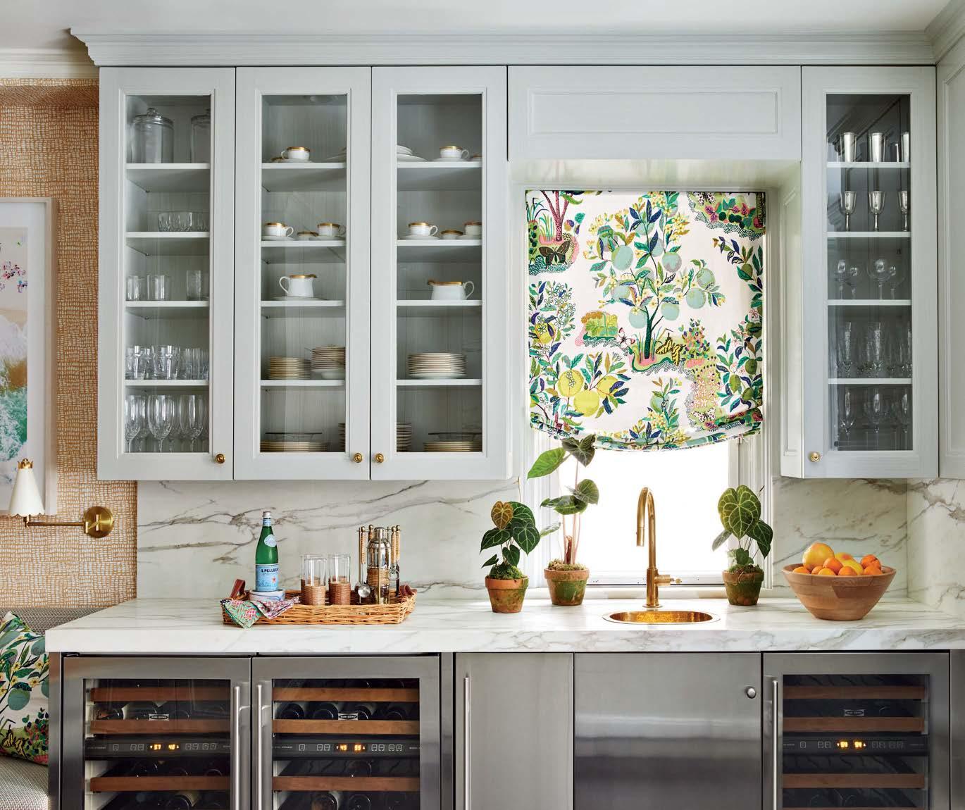 Above: A Roman shade in the wife’s favorite Schumacher pattern pops against glass-front cabinetry and Calacatta Gold countertops sourced from ABC Stone. The brass faucet and sink, both Waterworks, add further dressy touches.