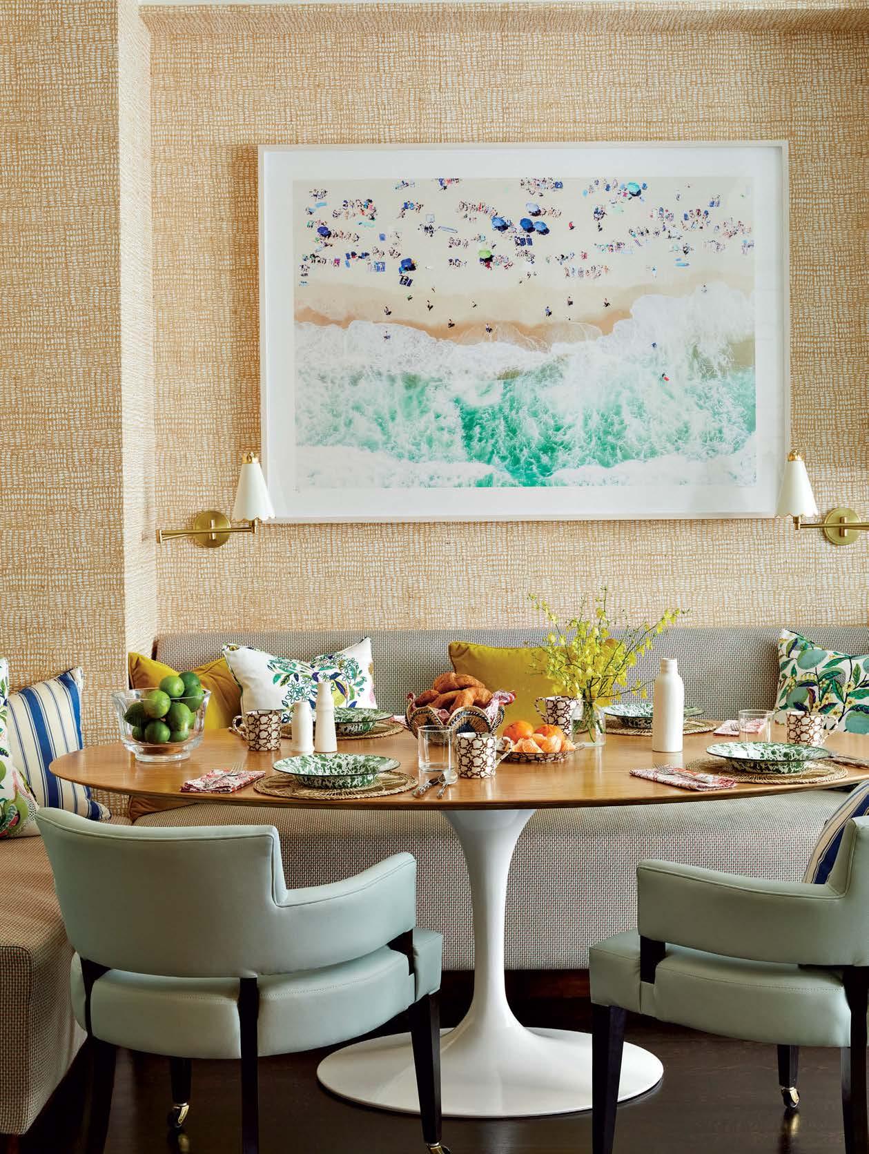 Opposite: Designed to withstand messes, the breakfast nook features chairs in a Scalamandré performance leather and a Pierre Frey-upholstered banquette. Coleen & Company sconces frame a Gray Malin photograph against a Holland & Sherry raffia wallcovering.