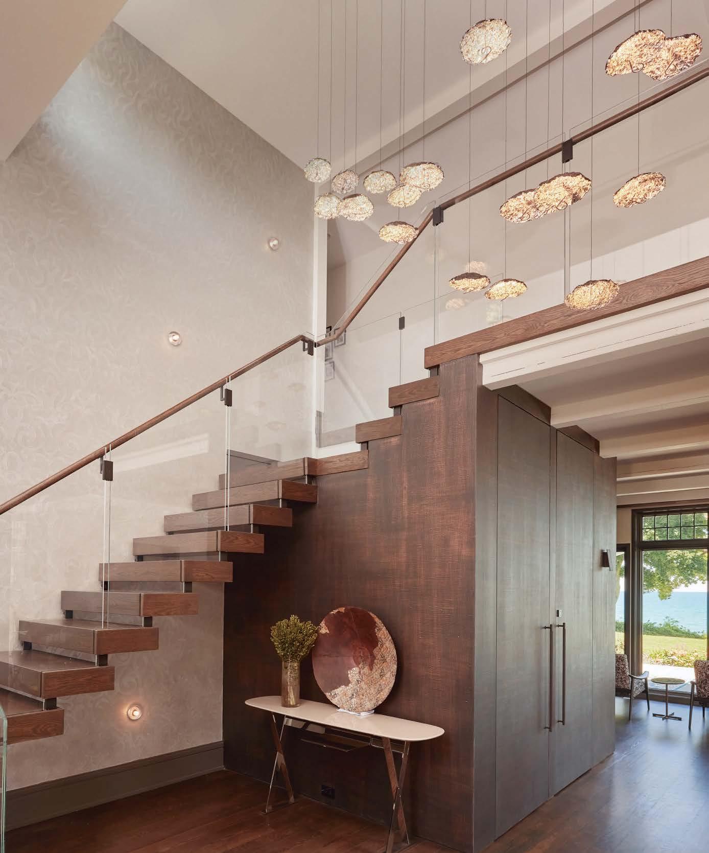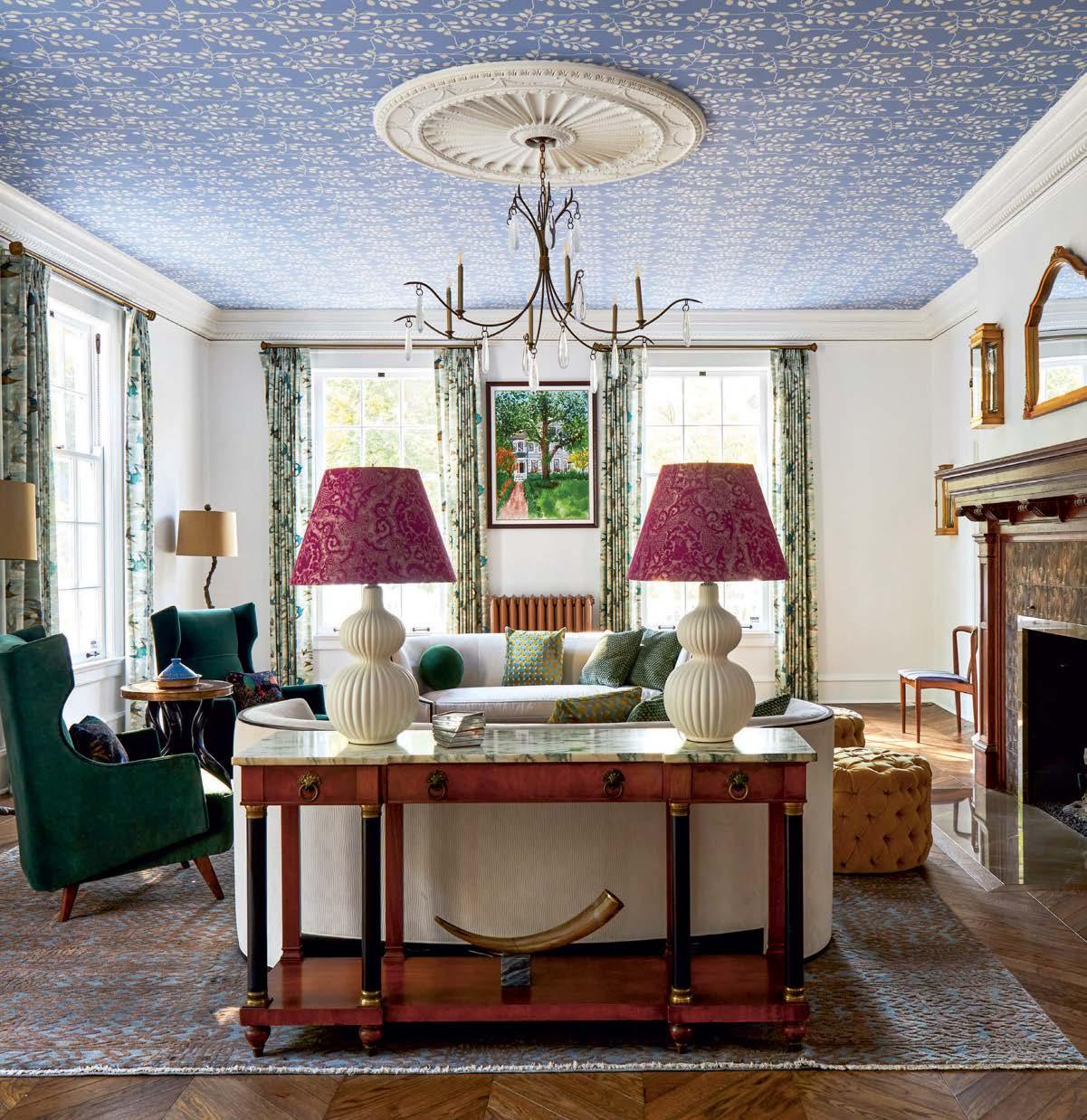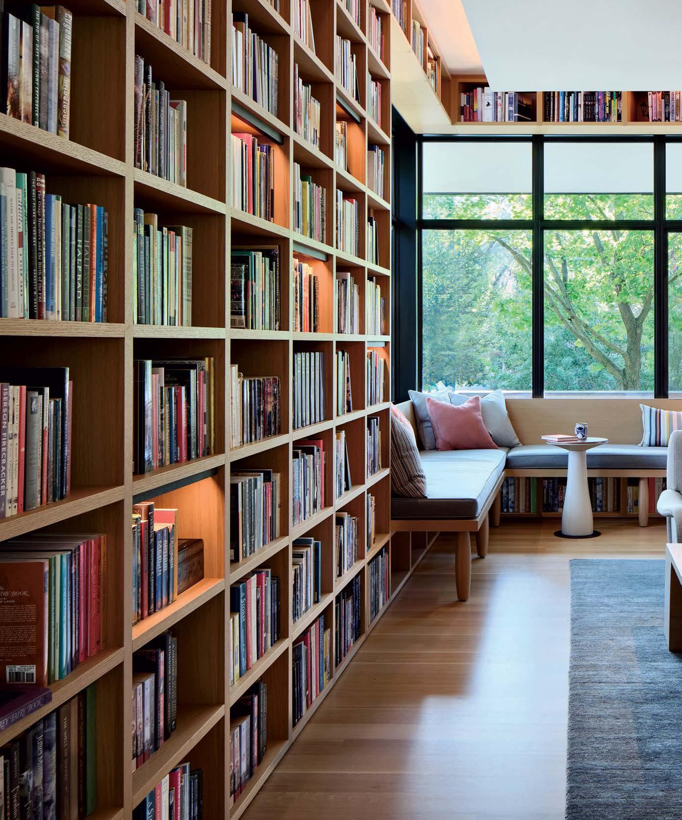 transformed the front sitting room of this Lakewood Balmoral residence into a library with floor-toceiling white oak shelves by Nature-Tech. The Dedar-covered Holly Hunt sofa, Cassina chairs and window seat with cushions in wool by TheSign offer plenty of spots to curl up with a book. Page 164