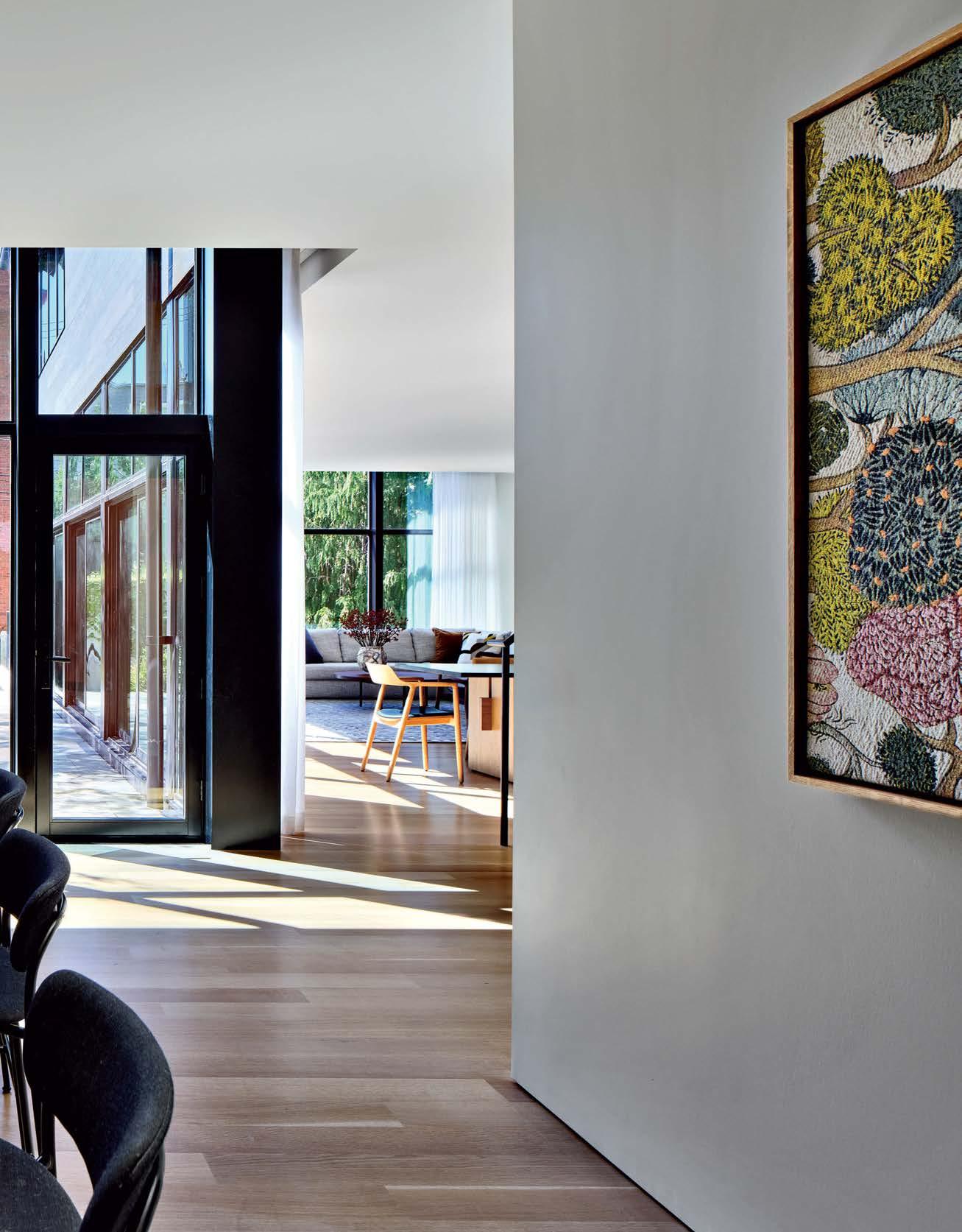 “Everything we did inside was meant to support this, as most of the art in the house is what you see through the windows.” Mindful of the major role the garden has here, landscape architect McKay designed it for all seasons. “There are evergreen plants, like boxwood, cedars and weeping cypress, that look beautiful in the snow,” she explains.