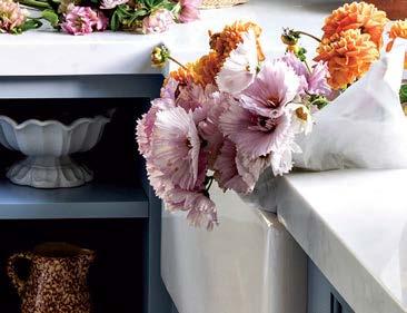 This unity is also apparent in the kitchen, whose renewal was completed in partnership with designer Ann Stockard of O’Brien Harris. “The team wanted the space to look light and airy, so they opted for open shelving with Parisian detailing,” Stockard says. As a natural extension of the living room, the kitchen more closely resembles a romantic restaurant in the 6th arrondissement of Paris. One subtle but powerful design choice drives it all: a pair of antiquedbrass lamps with pink linen shades, hardwired into the marble island. “The lamps add personality,” Dolenc notes. “Where one might be tempted to add pendants or a chandelier, they provide human scale.”