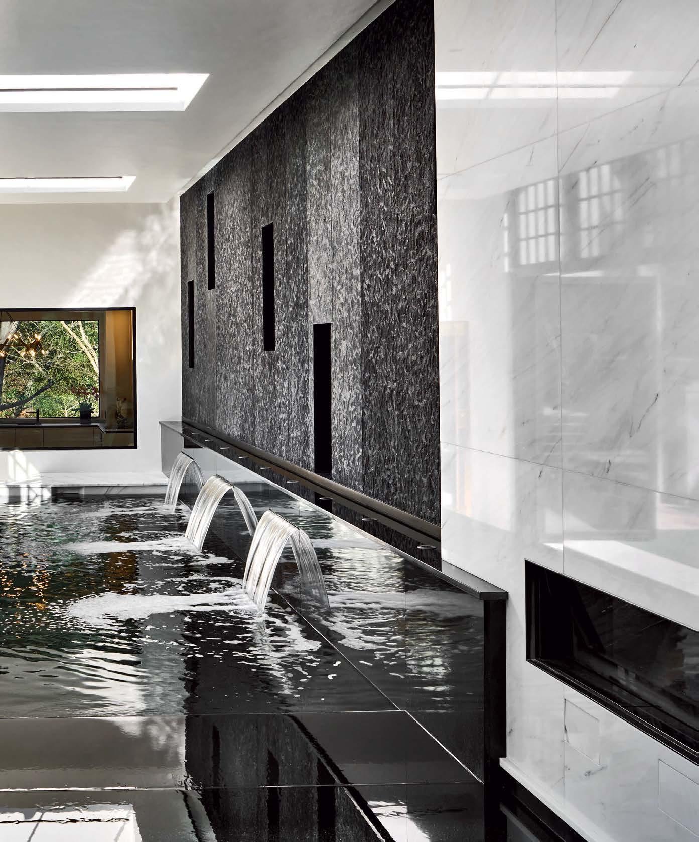 Material precision is also apparent in the indoor swimming pool, framed by gray-veined stone and folding doors that open onto manicured outdoor living spaces by landscape architect John Howard. The synthetic turf lawn is edged using the same marble as the terrace and pool deck, ensuring a cohesive connection to the exterior. Oakleaf holly shrubs, trimmed into structured hedges, further define the pool garden. “They’re clipped above head height for privacy but allow distant views into the majestic tree canopy of the adjacent city park,” notes Howard, whose minimalist design in varied shades of green provides the backdrop to urncapped limestone piers filled with seasonal flora.