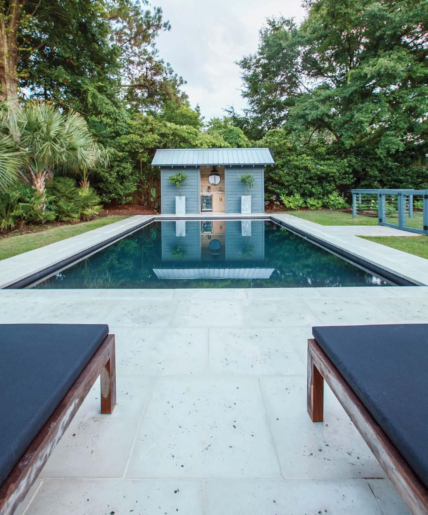To optimize their waterfront experience, the Finleys enlisted local landscape designer Jim Bloodworth. Ideas for their outdoor oasis were abundant; for example, Delvecchio insisted on an outdoor kitchen to indulge his love of the barbecue, so the landscape designer delivered with an expansive cabana. “We relandscaped the entire property, with a focus on improving the flow of activity from the house,” he recounts. Bloodworth then planted fragrant tea olive around the pool and integrated hot tub—a resort-like destination he conceived with the Finley’s daughter, Zoe, top of mind. “We routinely have groups of kids over for summer swim parties and host our closest friends’ kids for a week in June; we call it ‘Camp Finley,’ ” the designer says cheerily.