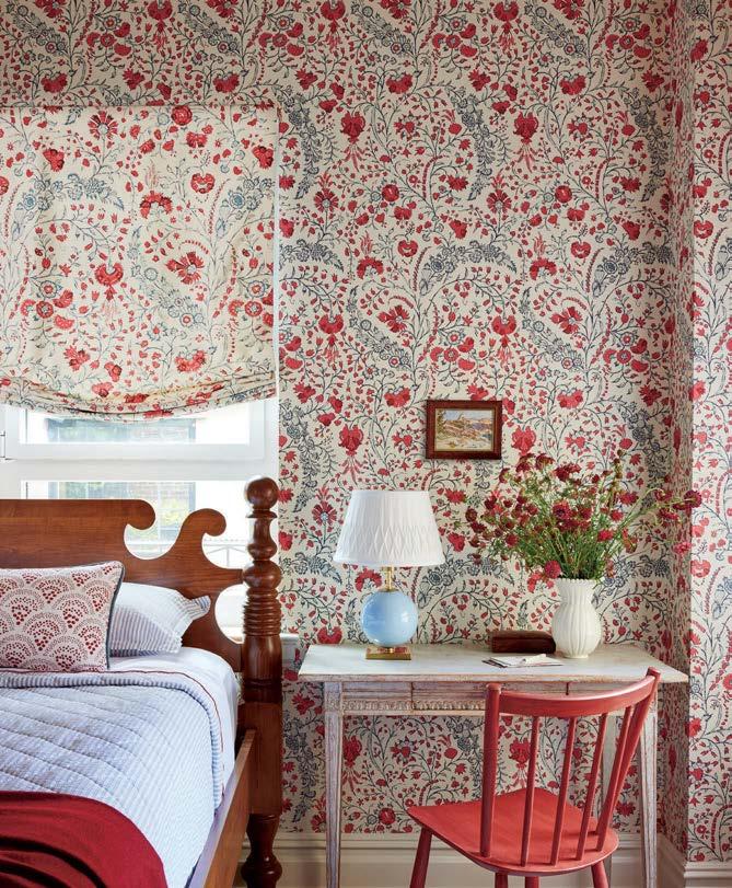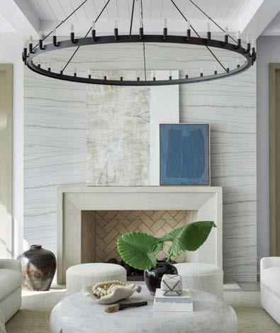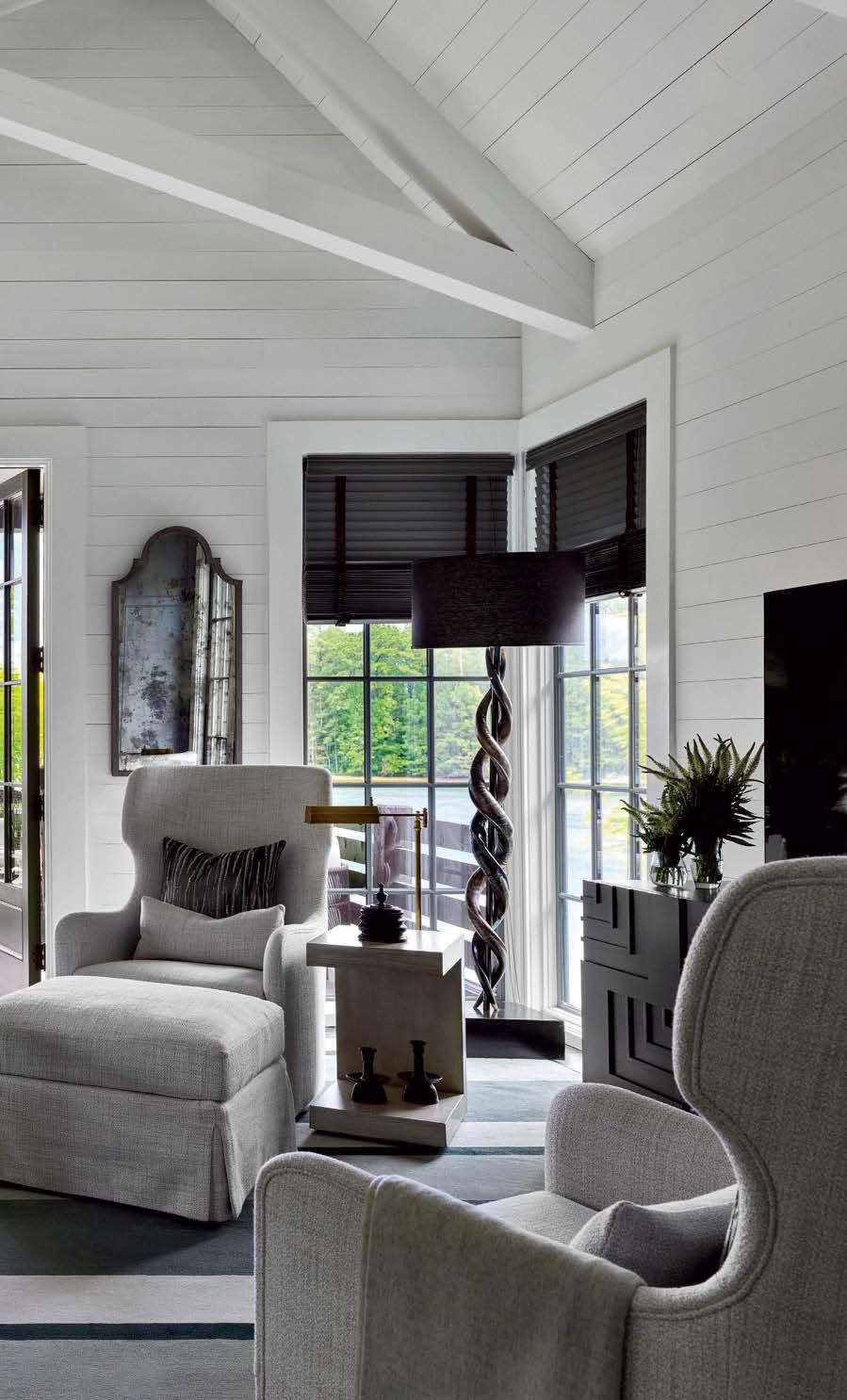 ON THE COVER: Awash in Benjamin Moore’s Decorator’s White, a scissor-trussed ceiling by architect David Baker crowns the family room of this Lake Martin, Alabama, retreat. Designer Susan Ferrier filled the space with gracious furnishings, including a wing chair and ottoman by Anees Furniture & Design from Paul Plus and a petite Eva Quateman Essentials chair wearing Mark Alexander velvet. Page 122