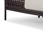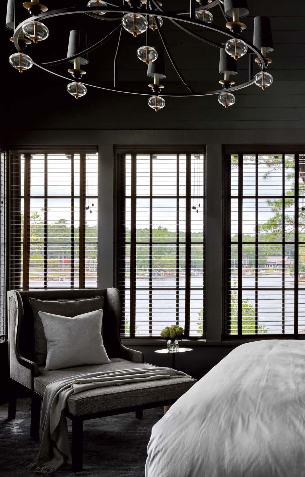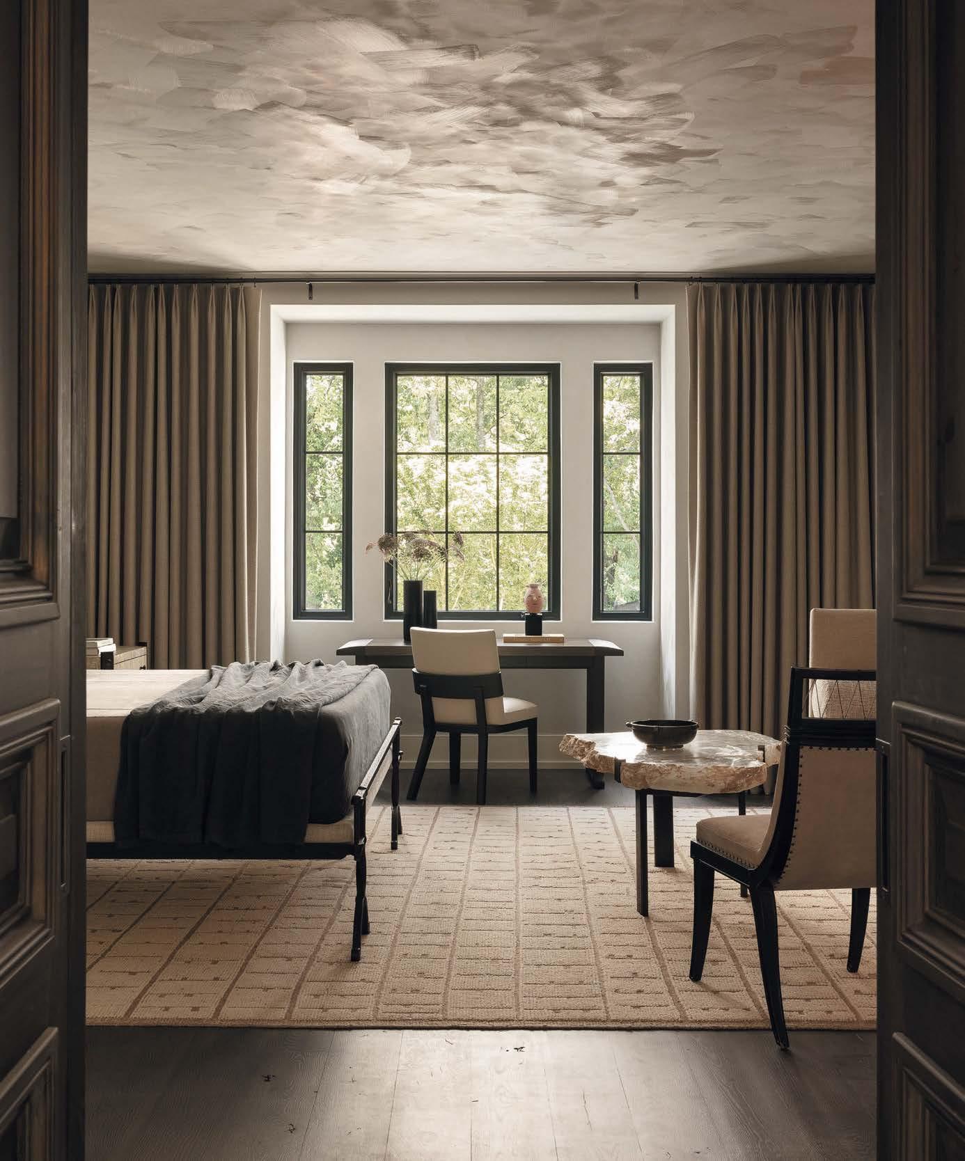 In the adjoining bedroom, a rich bronze tone envelops the walls, ceiling and trim, lending alluring contrast to the home’s lighter spaces. The complex hue pulls from several points on the color spectrum, hints of which are continuously revealed with the shifting sunlight. “It reacts to whatever light is filtering through those windows off the lake,” Ferrier explains, emphasizing how the saturated room harmonizes with the verdant landscape. “Compared to the brightness of the public spaces, the primary suite is such a private area, so it gets a little richer, a little cozier,” she comments. “We struck a balance of dark and light throughout this house.”