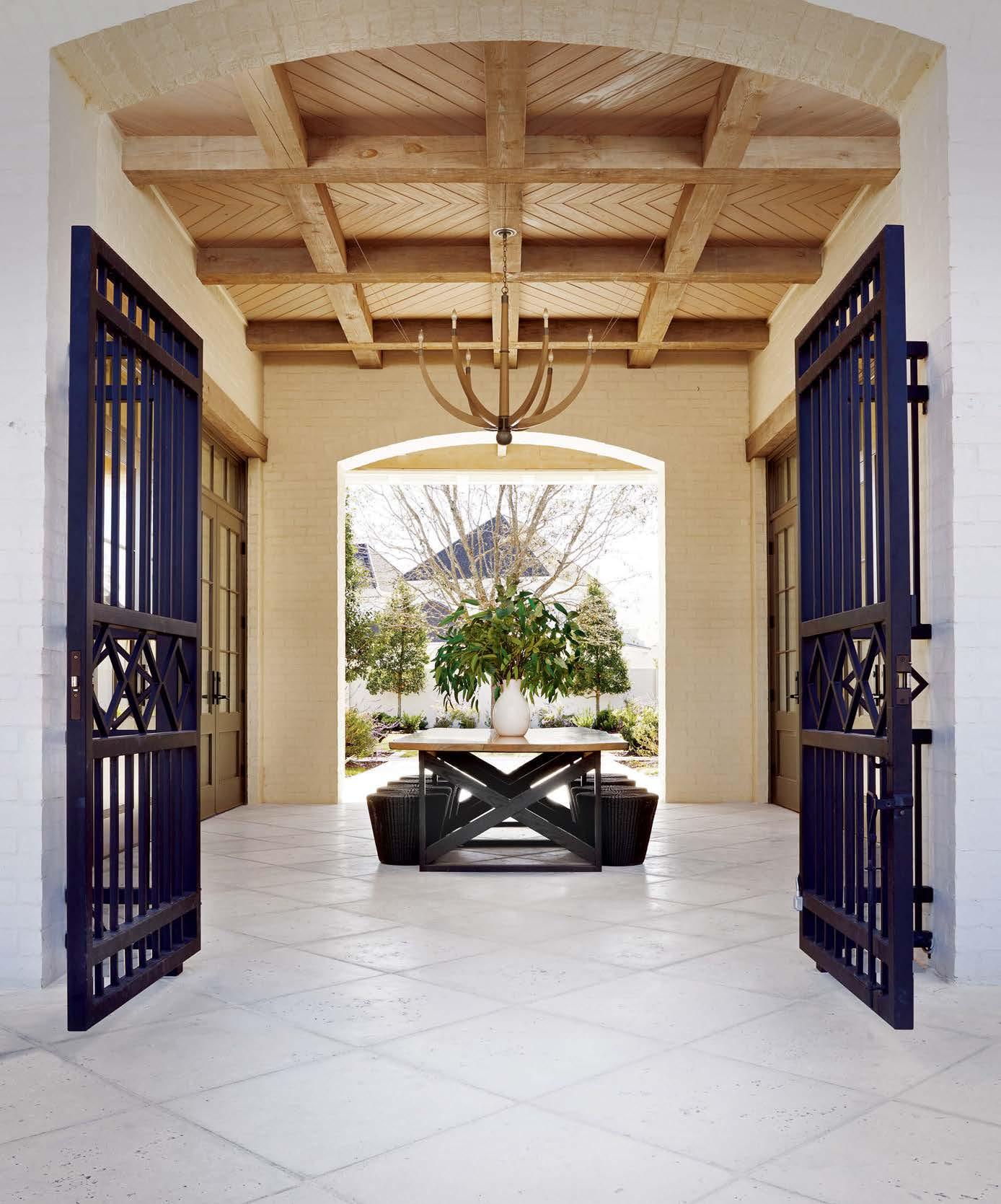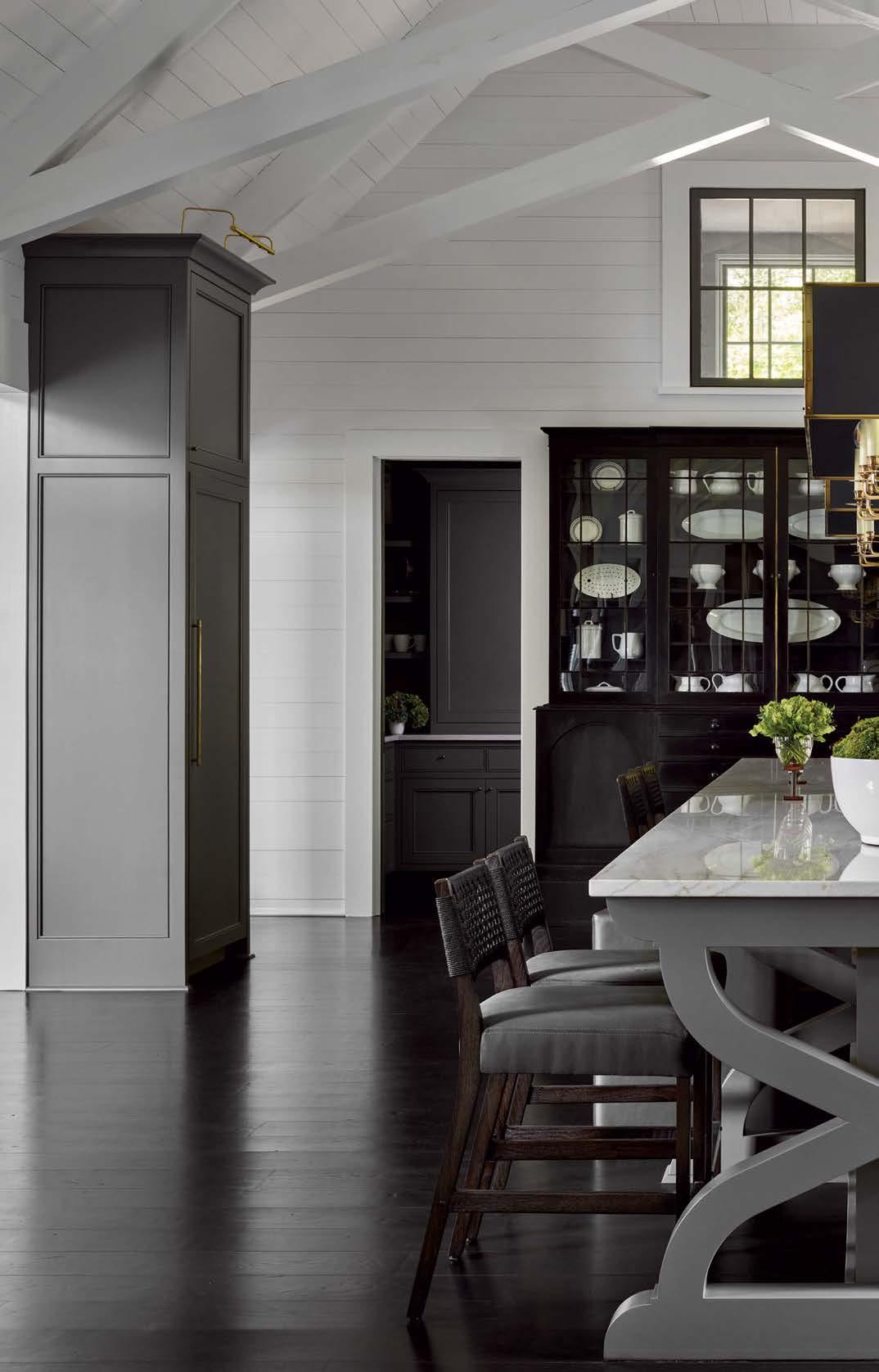 One of the most remarkable elements within the house is the dramatic scissor truss that crisscrosses over the kitchen and family room, giving this freeflowing area the feeling of a cathedral ceiling. This feature also keeps the 17-foot-tall vaulted heights from feeling too overwhelming, “bringing humility to the space,” Baker explains.