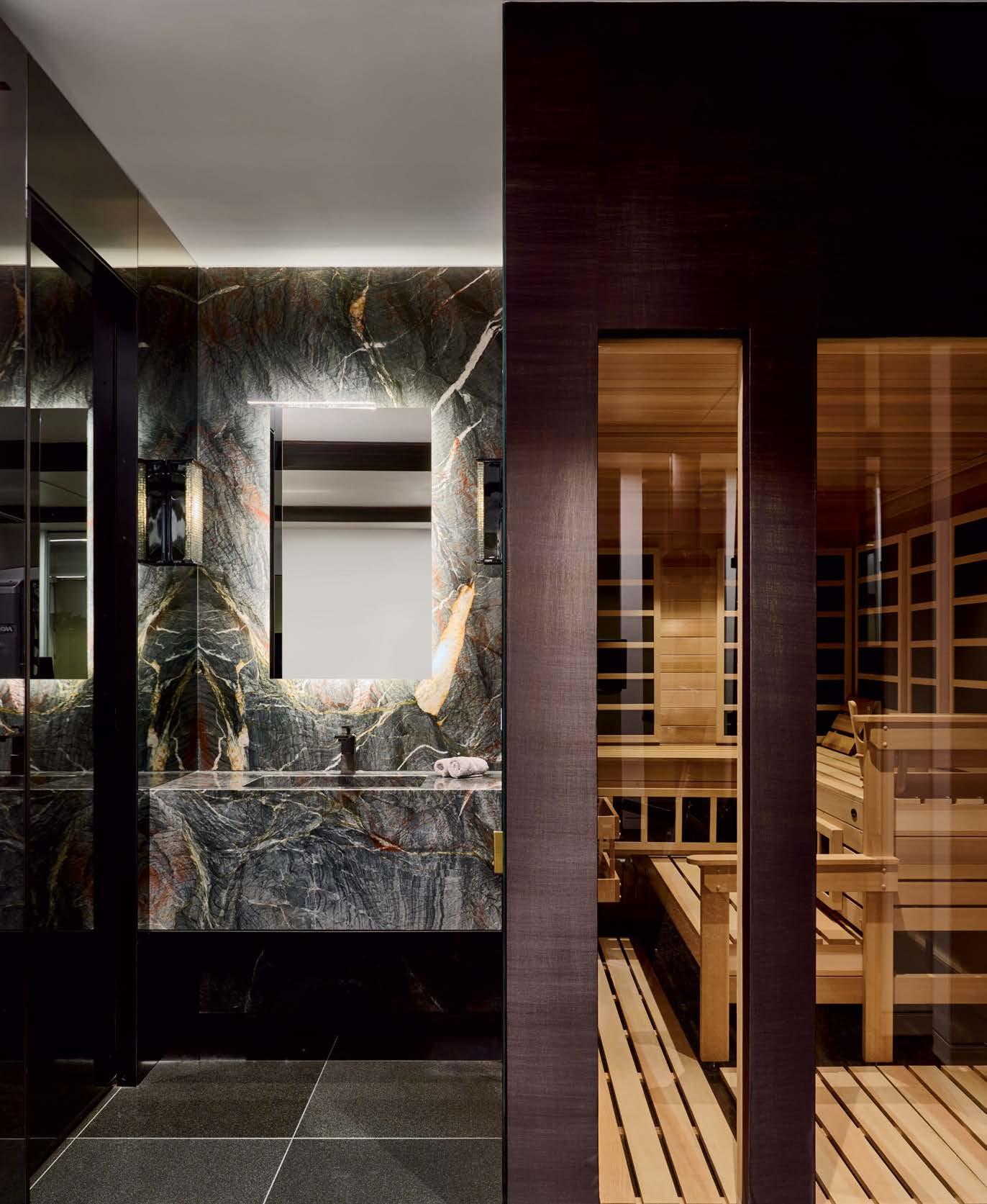 For Aaron, a three-dimensional feature wall was nonnegotiable—and it became the anchor point around which all other elements revolved. Early in the project, Hobby, Neely and the couple traveled to Verona, Italy, to source stones that would meet Aaron’s expectations. They landed on Dedalus, a striking specimen with rich black, blue and green veining. Hobby leveraged the material to customize the ridged, book-matched statement wall in the double-height living room. “As you walk by, you get this incredible optical illusion of movement,” Aaron describes.
