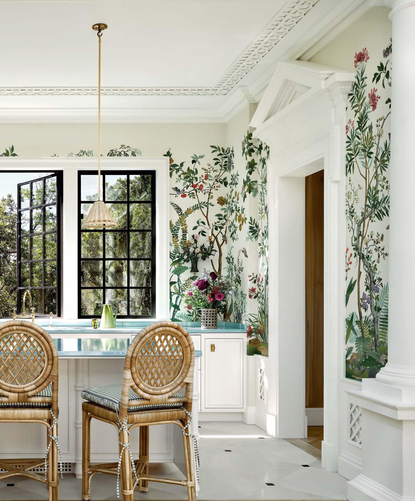 Given that her clients had commissioned a sports structure sited between the tennis and volleyball courts on their property, athletically attired interiors might have seemed like an easy win. But Salt Lake City-based Hillary Taylor’s design scheme blooms from the owners’ love of France— specifically, the orangerie at the Petit Trianon of Versailles, the famed private chateau of Marie Antoinette. Marrying the architecture of an orangerie with an activity-and entertaining-focused accessory building isn’t even that farfetched, says Taylor: Both are wellness-minded spaces devoted to leisurely pursuits. “Everything is about access to light,” she notes. A central glass ceiling presides over the pavilion’s multifaceted main gathering area, and is met by columns, cornices and details like a double Greek key frieze and ornamental treillage. The open kitchen, grounding one side of the main room, features a botanical wallcovering that emphasizes the structure’s greenhouse vibe, paired with glossy blue countertops that tie to the sky. A sportier counterpoint comes via the bathroom, rendered in crisp green and white. “The architectural detailing is a lot more formal than the way this retreat is lived in, but that’s appropriate for life,” comments the designer, who worked with architect Jon Jang, residential designer Bradford R. Houston and general contractor Mike Dahl to complete the sophisticated pavilion. “You should be able to use knockout spaces.” hillarytaylorinteriors.com