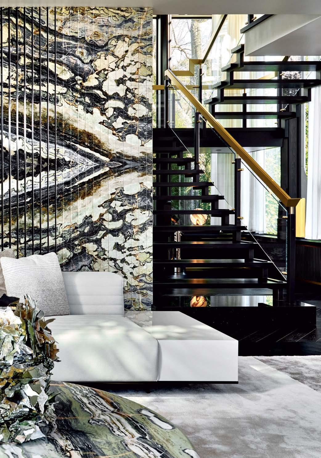 To counterbalance the room’s dramatic stone, Hobby introduced tactile upholstery in bouclé, mohair and nubuck leather, complemented by wool-and-cashmere draperies. Lacquered brass and bronze accents layer in elegant patina.