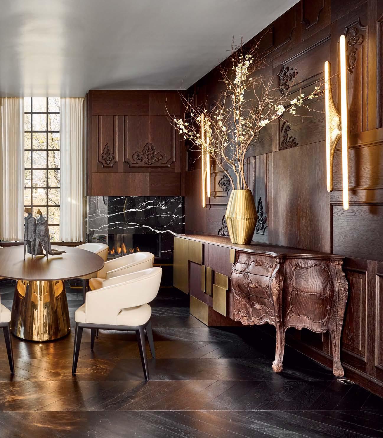 A similar juxtaposition of materials continues into the dining room, where a Nero Marquina marble fireplace, solid cast-bronze dining table and sculptural sconces pop against alternating panels of intricate Italian boiserie. The handcarved wooden embellishments, arranged in a deconstructed pattern, add a modern playfulness.