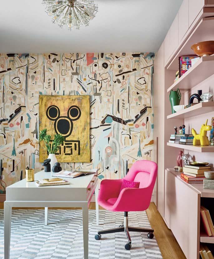 Opposite, clockwise from top left: A graphic wallpaper by The Pattern Collective graces the powder room, accented by Visual Comfort & Co. sconces; the faucet, sink, vanity and hardware are Kohler. An Eames chair and Wildwood desk outfit the office, which features an Area Environments mural from Jim Thompson backdropping the André Renay painting. Marble from Walker Zanger spans the kitchen, offsetting InVogue Woodworks cabinetry; the counter stools are Magis, and the faucet is Kohler. The primary bedroom is furnished with a Loloi Rugs floor covering and Crate & Barrel nightstand, with walls painted Benjamin Moore’s Water’s Edge.