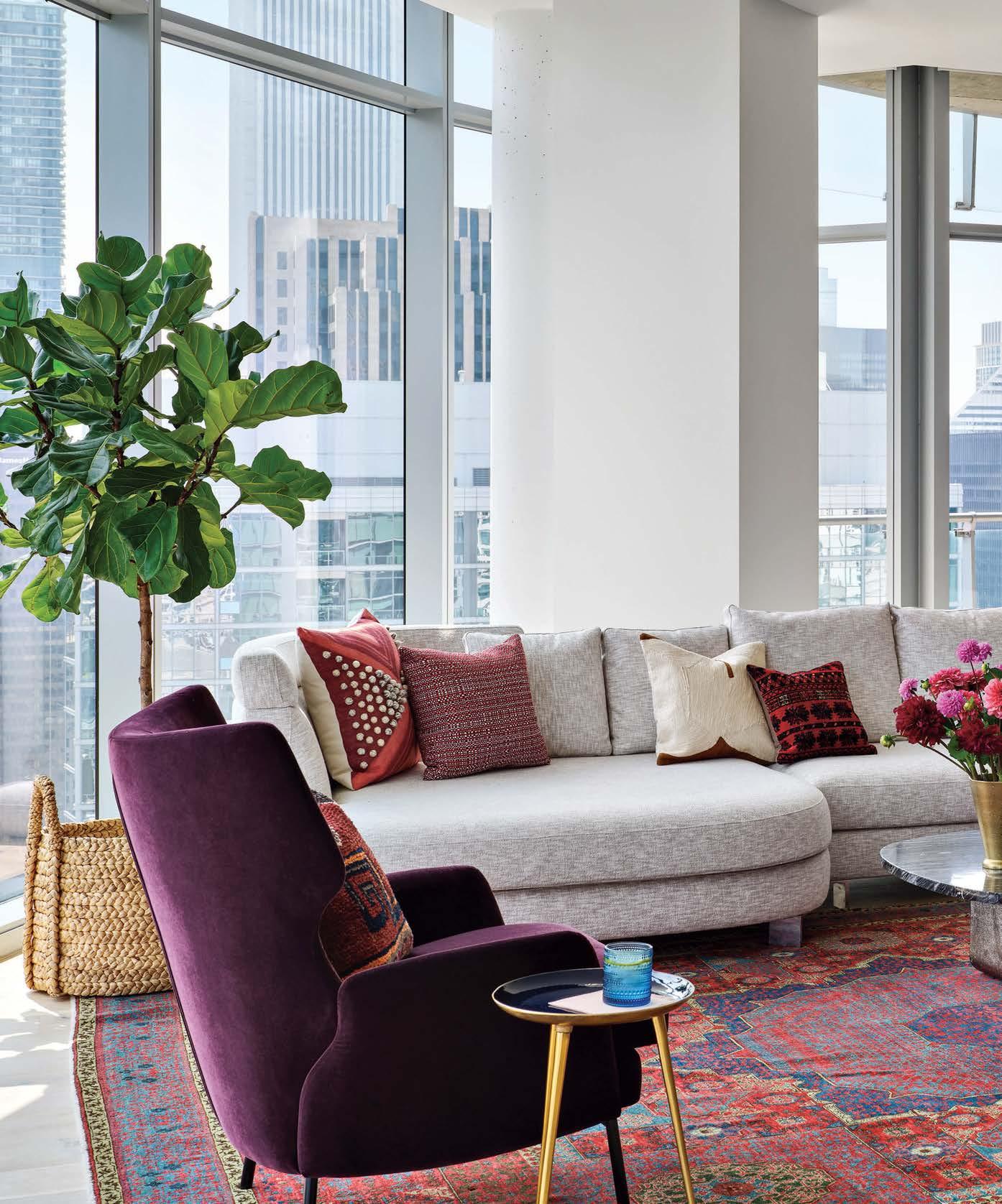 Some interior designers prefer to start with a blank slate, but Lambrini Schwartz was delighted when her clients produced their collection of Turkish kilim rugs during the planning stages for the remodel of this Gold Coast penthouse. “At first, they were trepidatious about suggesting them,” Schwartz says of the colorful floor coverings. “However, I loved the idea. They add a warmth and humanity to the space by telling the homeowners’ story.” Celebrating her clients’ Turkish heritage and embracing the Lake Michigan outlooks became two of the designer’s primary directives.