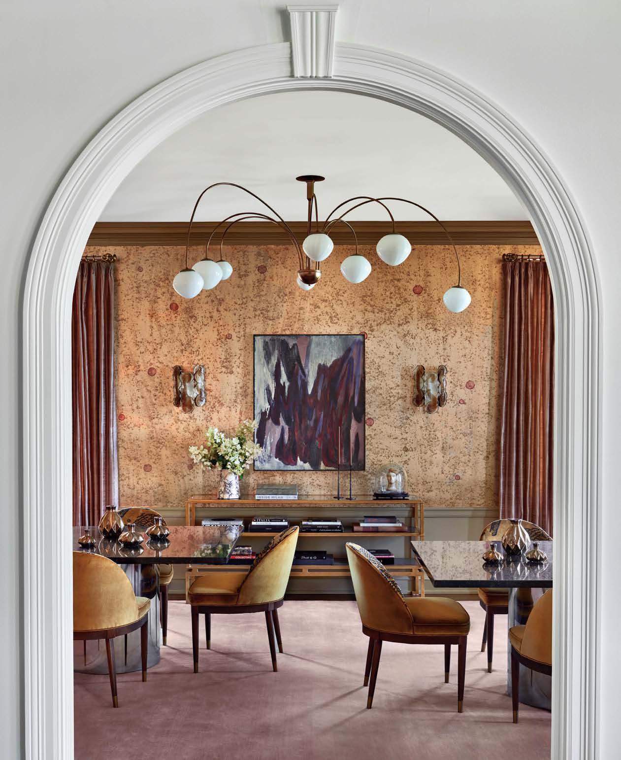 Imbuing an approachable atmosphere in the front three rooms, Lagrange found ways to make each a purposeful destination. The color palette goes moody in the green-walled library, where she carved out a bar, selected a dusty-rose tufted sofa and arranged a seating area near a window. In the adjacent living room, curved furnishings create a fluid floor plan atop a rug with an abstract pattern made from a scan of a human skull—a nod to the owner’s profession—while a soft-pink, high-gloss lacquered ceiling reflects light. “The rest of the room is off-white, so it needed the pop,” Lagrange explains. And now used for daily meals, the dining room features the family’s twin 1980s black granite tables, which can be pushed together or separated into two seating groups. Pink appears in the room’s ombre rug and on circles painted atop the brassy, metallic wallpaper, adding a custom touch.