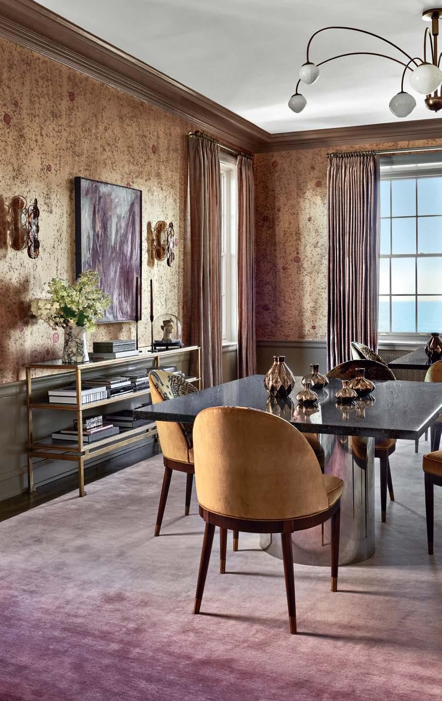 “One of the big hurdles was the large wall dividing the kitchen and living room,” Schwartz says. “The homeowners wanted an open and airy sensibility and to be able to enter and immediately see the beautiful views.” Working with general contractor Martin Barboza, the wall came down easily, but then the real challenges began. “Since this is a condo, there is only so much you can do in terms of moving things,” the designer notes. “That forced us to be more creative.” In the kitchen, the plumbing could not shift, and the location of the sink and appliances had to remain the same. But everything around them changed. The demolition of the wall allowed for a large dining table ideal for entertaining as well as city and water views to be visible throughout the public spaces. A new bar-height table along a bank of kitchen windows gives the clients a front-row seat to the scenery and provides a place for coffee or tea. Cabinets crafted with light oak and charcoalpainted wood join countertops and a backsplash made of honed leathered quartzite, a stone the designer says invites hands to run across its surface. “I like to design for the senses, and this is a tactile experience,” Schwartz says.
