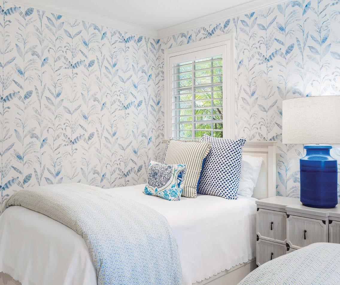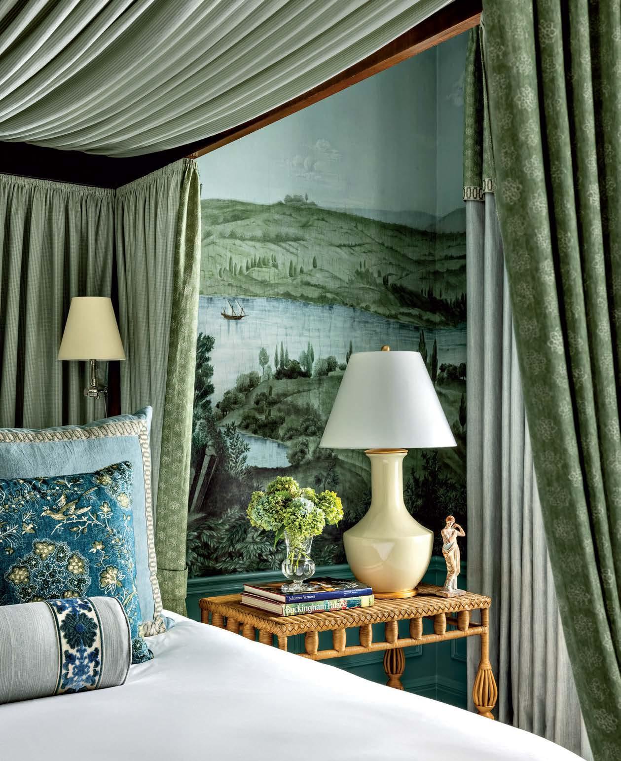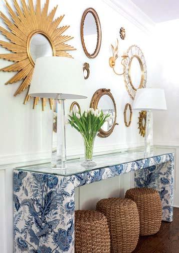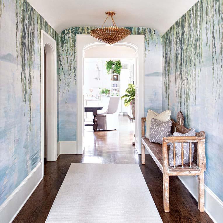ABOVE Phillip Jeffries Serenity mural wallpaper makes an entrance. TOP This custom Bjork Studio console table is complete with Schumacher Sandoway Vine fabric and pairs beautifully with vintage mirrors. CENTER Zoffany wallpaper and Noir nightstands combine for a relaxing primary retreat. BOTTOM A vintage side table with a custom McGuire accent chair add some pop to this family room. PHOTOGRAPHY Heidi Harris
