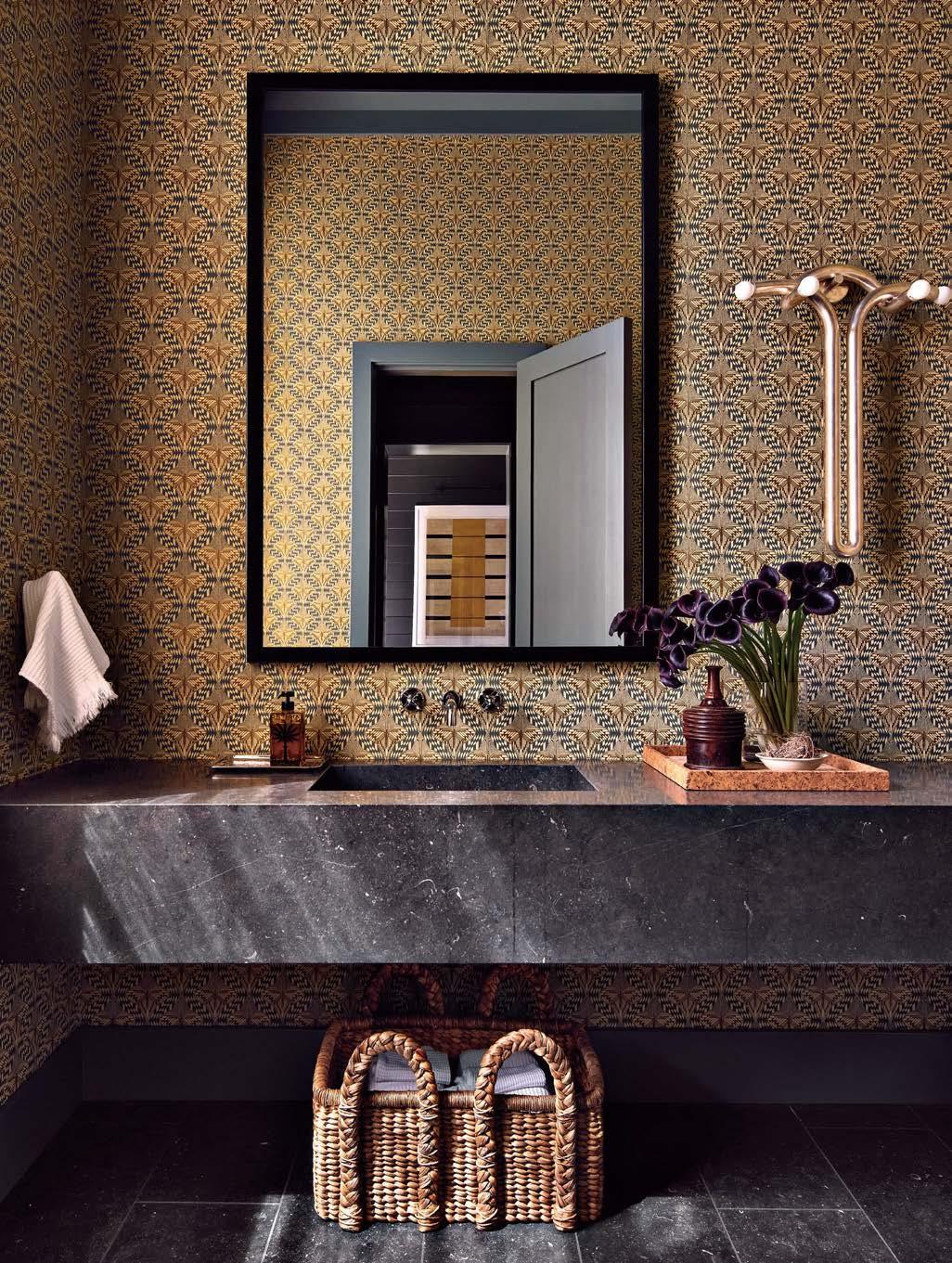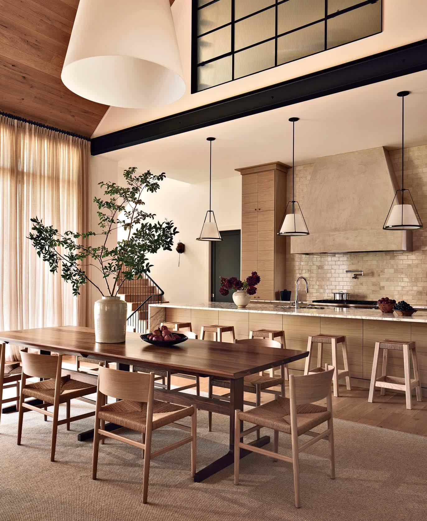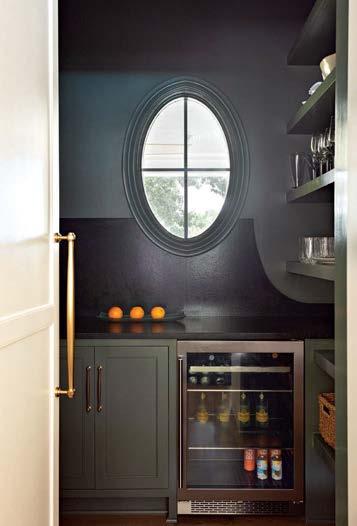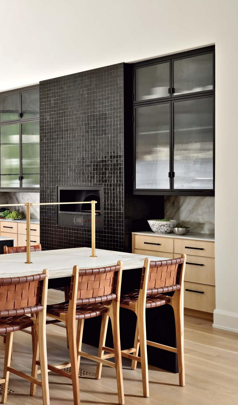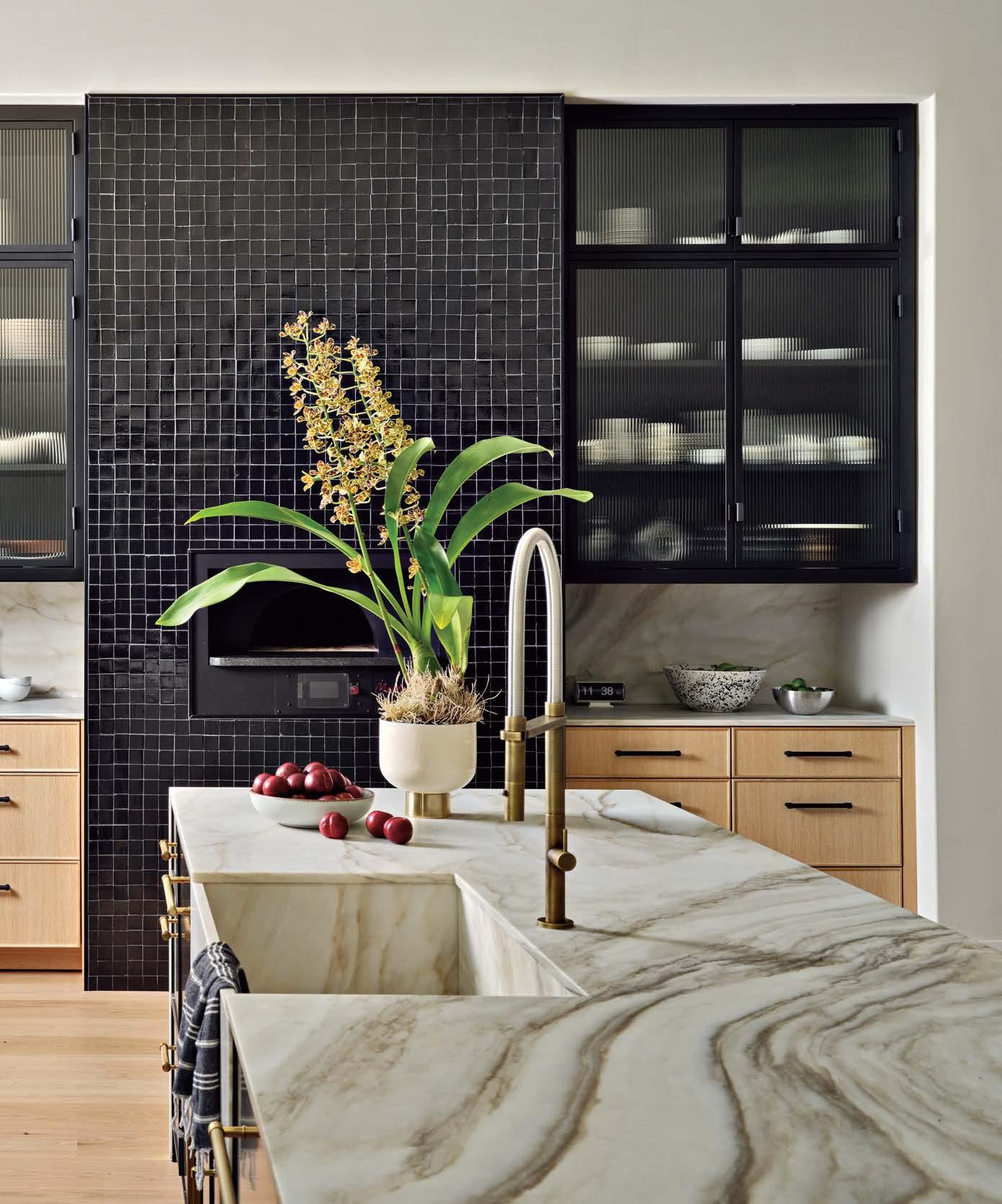 This soft sensibility figures into the palette as well. Although Davis is known for her confident use of color, here she tried something else. “It’s our version of neutral,” the designer quips. “We took a lot of our cues from the greens and coppers in the verdant landscape surrounding the house.” Upholstery in shades of green, blush, taupe and gray set the stage—but this straightforward scheme is emboldened by pillows and carpets featuring striking patterns and hues, plus colorful artwork that elevates the home’s convivial mood. Nodding to the foyer’s monochromatic floor, Davis also leveraged the power of black to ground the kitchen. Its richness balances the warm honey oak cabinets, appearing in the zellige tiles cladding the pizza oven as well as metal frames defining the translucent-glass display cabinets.