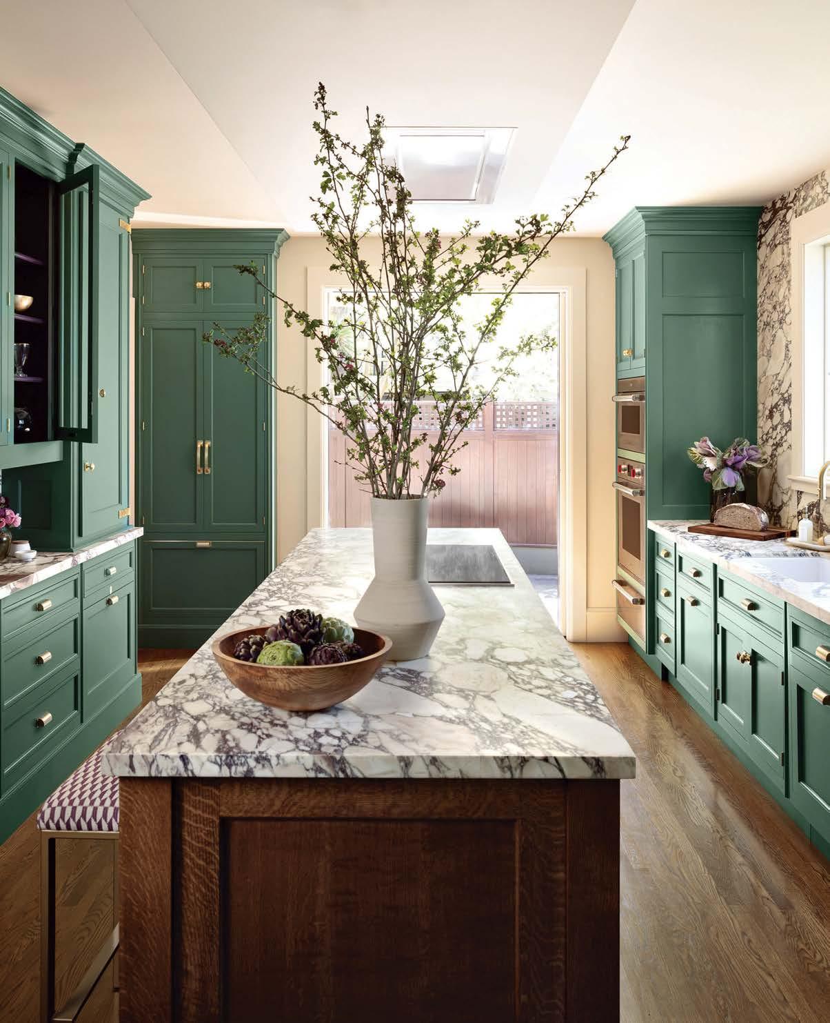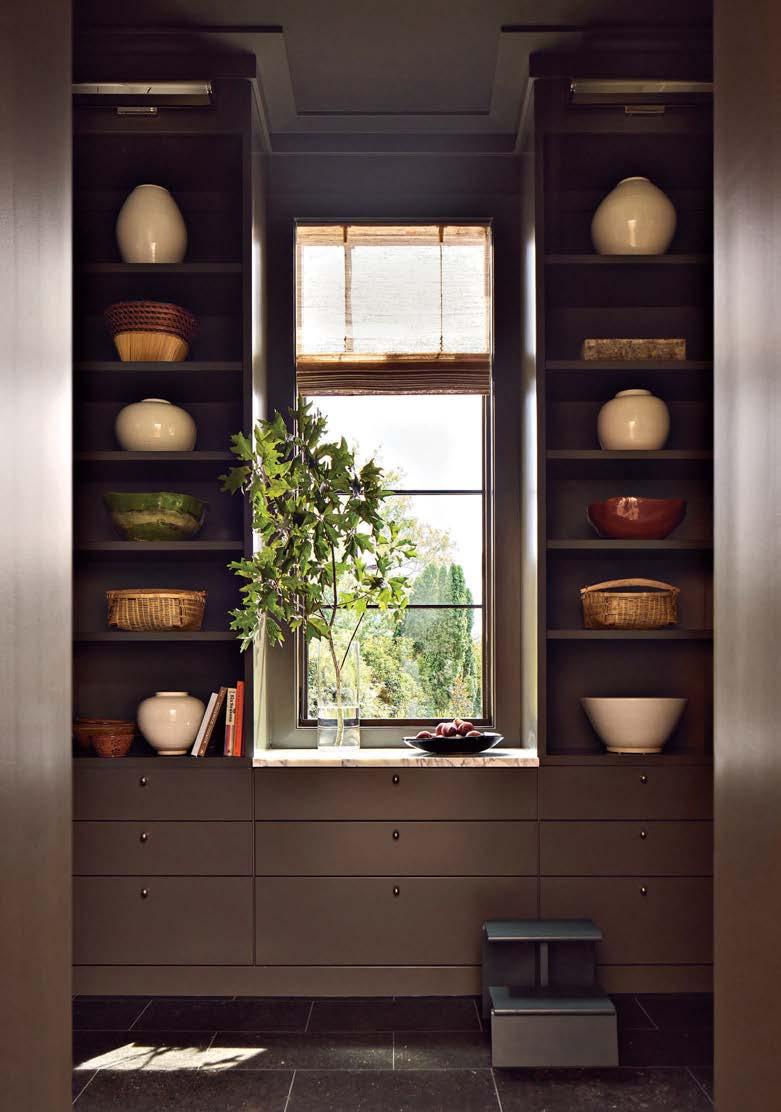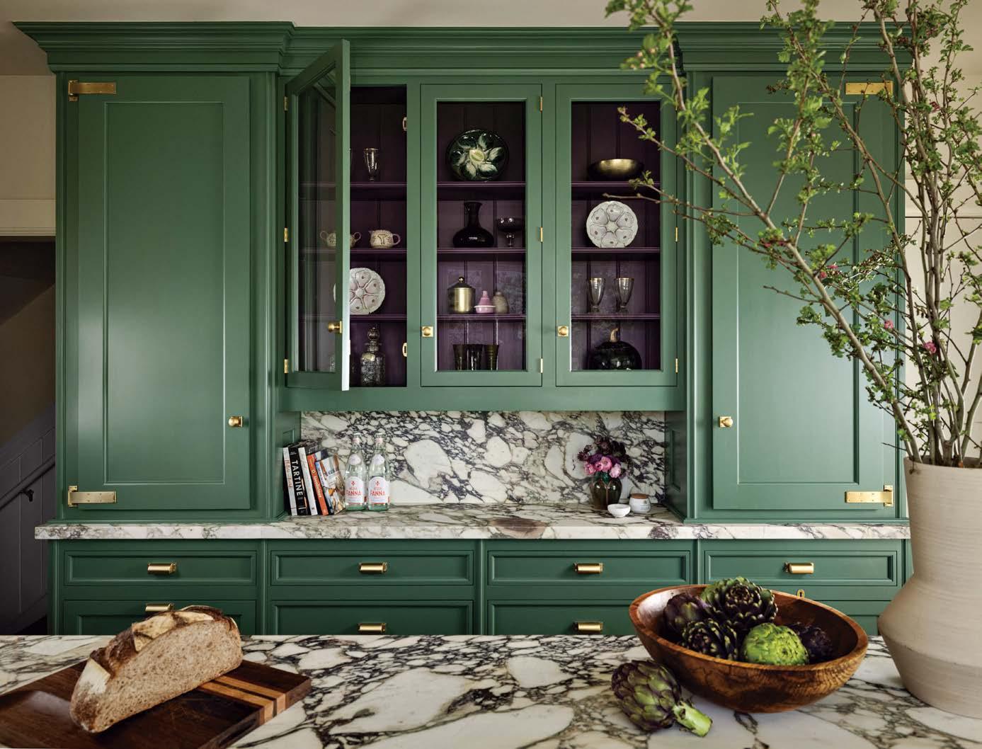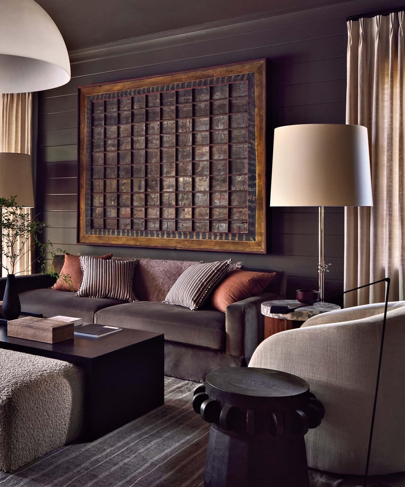 This soft sensibility figures into the palette as well. Although Davis is known for her confident use of color, here she tried something else. “It’s our version of neutral,” the designer quips. “We took a lot of our cues from the greens and coppers in the verdant landscape surrounding the house.” Upholstery in shades of green, blush, taupe and gray set the stage—but this straightforward scheme is emboldened by pillows and carpets featuring striking patterns and hues, plus colorful artwork that elevates the home’s convivial mood. Nodding to the foyer’s monochromatic floor, Davis also leveraged the power of black to ground the kitchen. Its richness balances the warm honey oak cabinets, appearing in the zellige tiles cladding the pizza oven as well as metal frames defining the translucent-glass display cabinets.