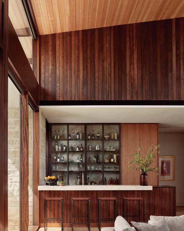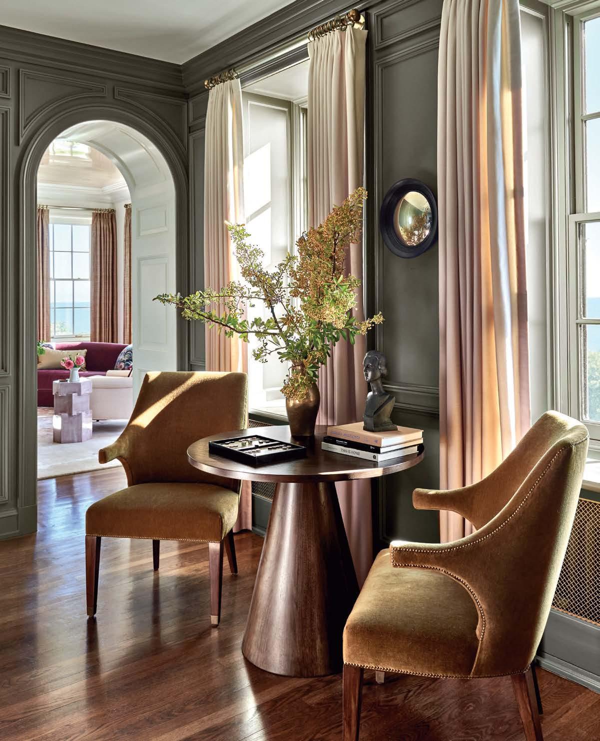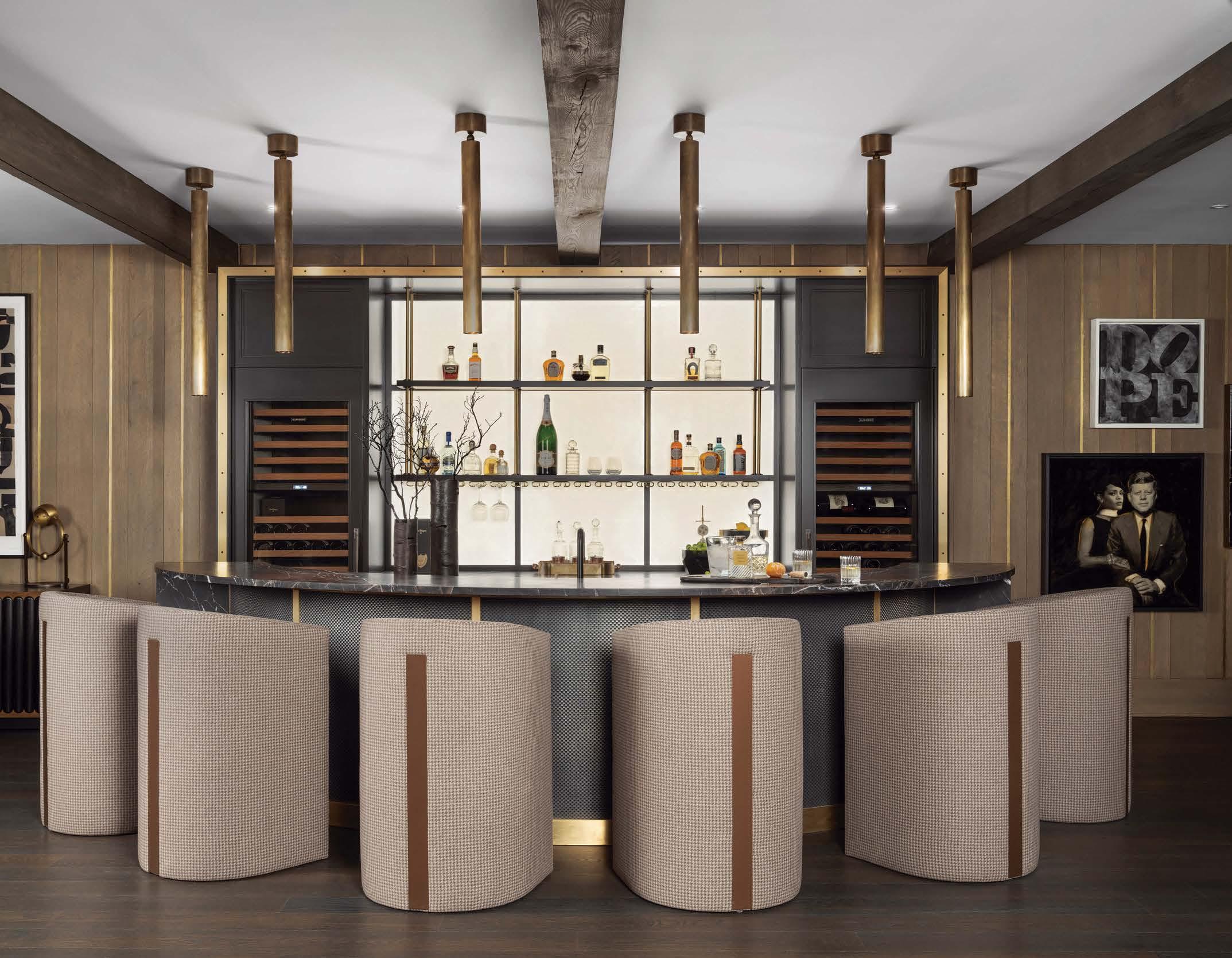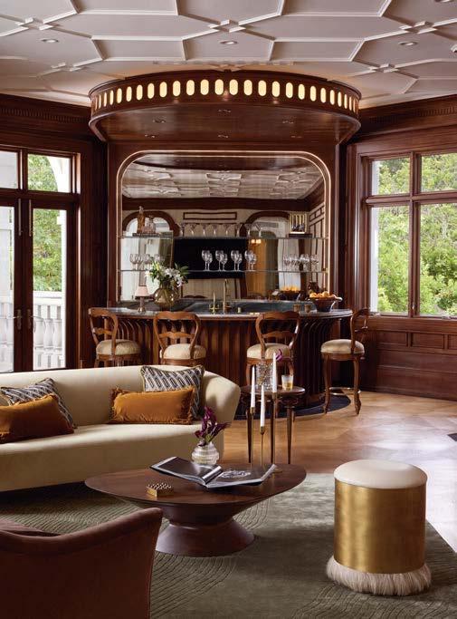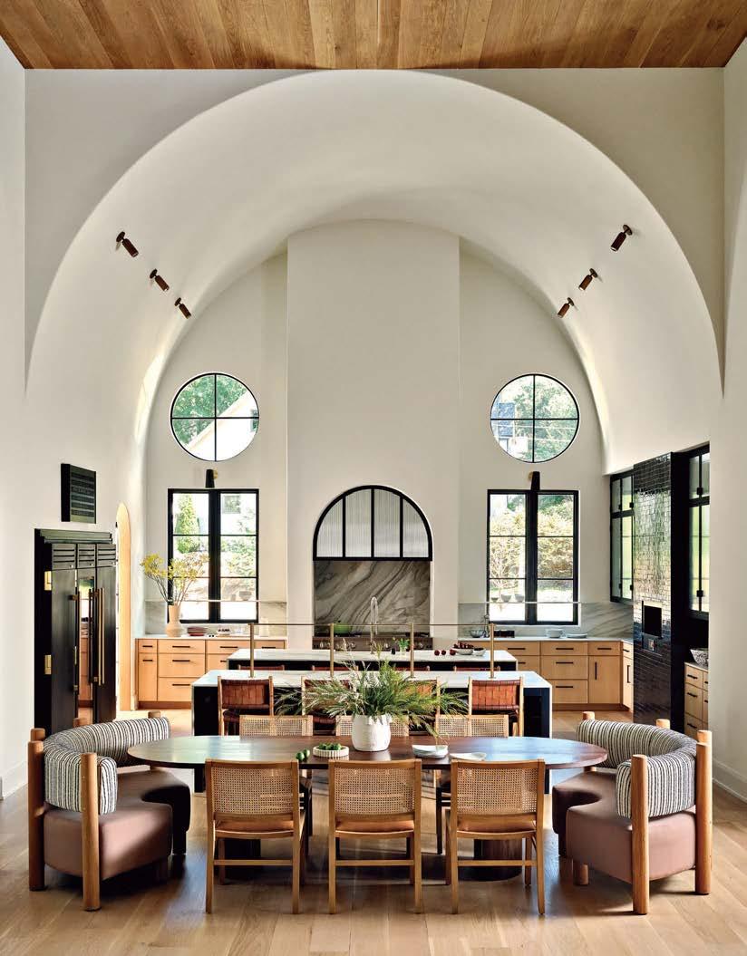 As appealing as large communal areas can be, Davis admits they can also present a challenge for space planning and decor. “It’s important to make things more human and livable—creating zones and rooms within rooms,” she notes. To foster intimacy, and echo the curved forms, “We added a barrel vault over the kitchen and repeated a shallower version over the bar opposite,” she says. “The paneled ceiling also brings down the scale and warms things up.”
